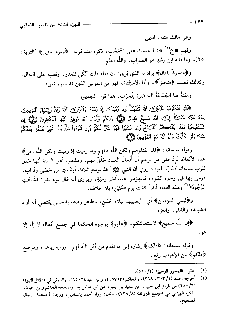 فَلَمْ تَقْتُلُوهُمْ وَلكِنَّ اللَّهَ قَتَلَهُمْ وَما رَمَيْتَ إِذْ رَمَيْتَ وَلكِنَّ اللَّهَ رَمى وَلِيُبْلِيَ الْمُؤْمِنِينَ مِنْهُ بَلاءً حَسَناً إِنَّ اللَّهَ سَمِيعٌ عَلِيمٌ (17) ذلِكُمْ وَأَنَّ اللَّهَ مُوهِنُ كَيْدِ الْكافِرِينَ (18) إِنْ تَسْتَفْتِحُوا فَقَدْ جاءَكُمُ الْفَتْحُ وَإِنْ تَنْتَهُوا فَهُوَ خَيْرٌ لَكُمْ وَإِنْ تَعُودُوا نَعُدْ وَلَنْ تُغْنِيَ عَنْكُمْ فِئَتُكُمْ شَيْئاً وَلَوْ كَثُرَتْ وَأَنَّ اللَّهَ مَعَ الْمُؤْمِنِينَ (19)