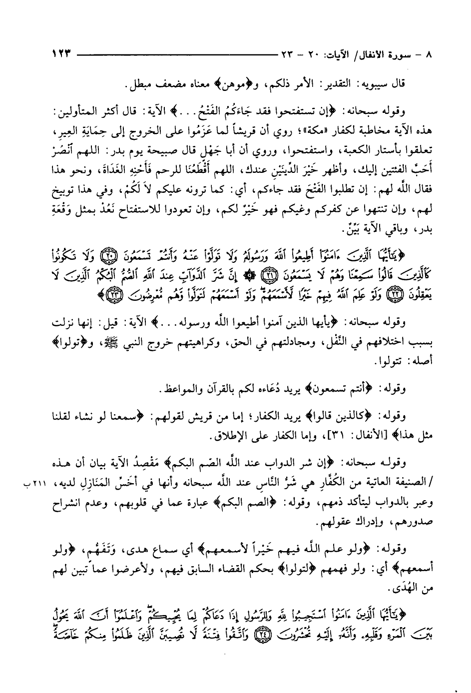يا أَيُّهَا الَّذِينَ آمَنُوا أَطِيعُوا اللَّهَ وَرَسُولَهُ وَلا تَوَلَّوْا عَنْهُ وَأَنْتُمْ تَسْمَعُونَ (20) وَلا تَكُونُوا كَالَّذِينَ قالُوا سَمِعْنا وَهُمْ لا يَسْمَعُونَ (21) إِنَّ شَرَّ الدَّوَابِّ عِنْدَ اللَّهِ الصُّمُّ الْبُكْمُ الَّذِينَ لا يَعْقِلُونَ (22) وَلَوْ عَلِمَ اللَّهُ فِيهِمْ خَيْراً لَأَسْمَعَهُمْ وَلَوْ أَسْمَعَهُمْ لَتَوَلَّوْا وَهُمْ مُعْرِضُونَ (23)