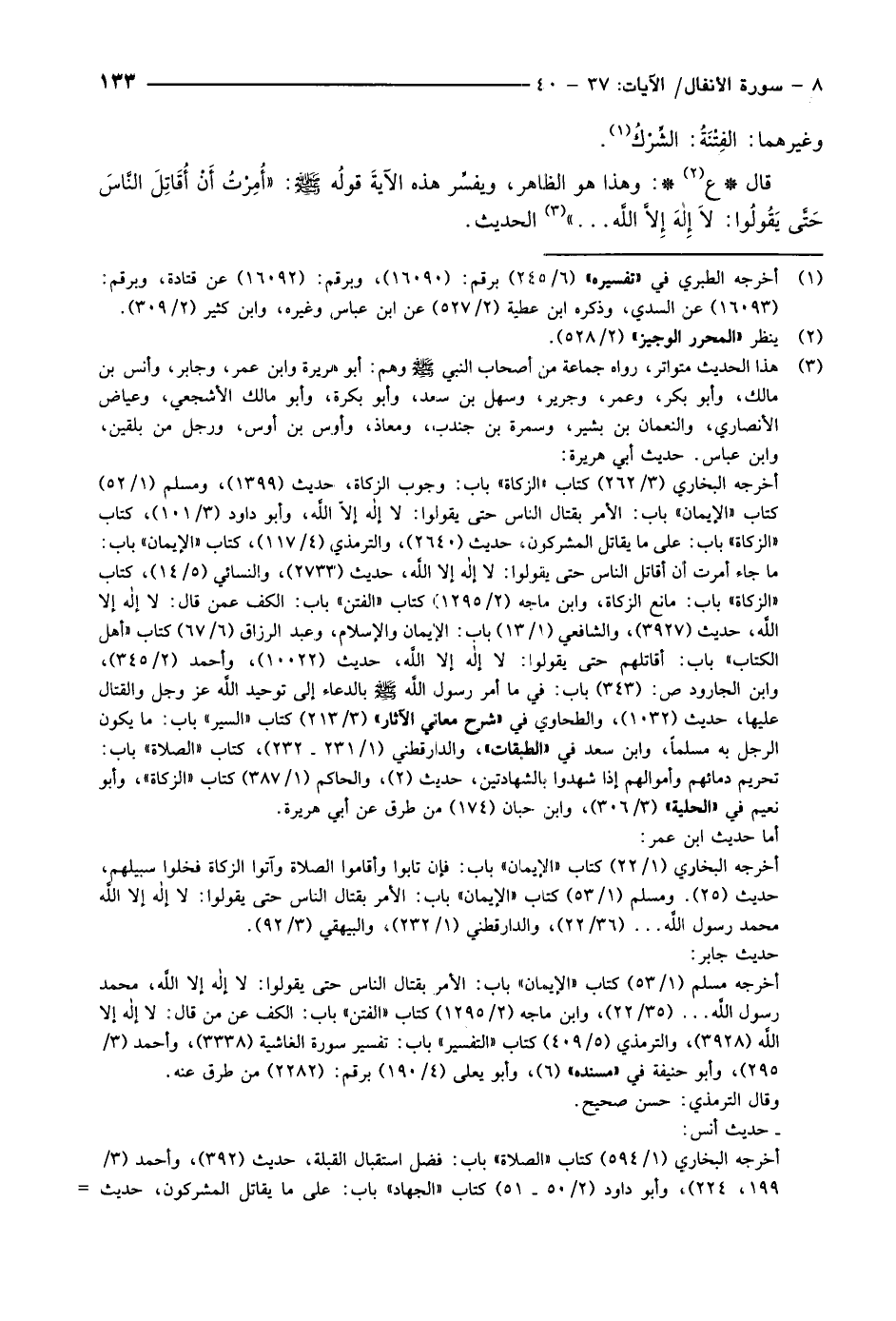 قال ع «2» : وهذا هو الظاهر، ويفسّر هذه الآية قوله صلّى الله عليه وسلّم: «أُمِرْتُ أَنْ أُقَاتِلَ النَّاسَ حَتَّى يَقُولُوا: لاَ إله إلّا الله ... » «3» الحديث.
