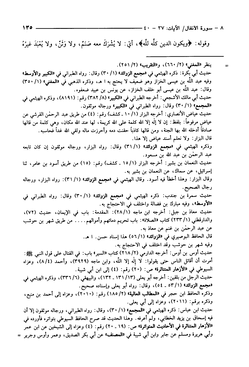 حديث ابن عباس: ذكره الهيثمي في «المجمع» (1/ 30) ، وقال: رواه الطبراني، ورجاله موثقون إلا أن فيه إسحاق بن يزيد الخطابي، ولم أعرفه. وهذا الحديث قد صرح الحافظ السيوطي بتواتره فأورده في «الأزهار المتناثرة في الأحاديث المتواترة» ص: (19- 20) رقم: (4) وعزاه إلى الشيخين عن ابن عمر وأبي هريرة ومسلم عن جابر وابن أبي شيبة في «المصنف» عن أبي بكر الصديق، وعمر وأوس وجرير