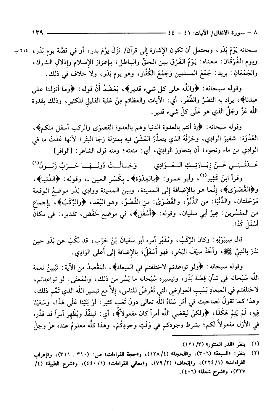 وقرأ ابنُ كَثِير «2» ، وأبو عمرو: بِالْعُدْوَةِ- بِكَسْرِ العين-، وقوله: الدُّنْيا، والْقُصْوى، إِنَّما هو بالإِضافة إِلى المدينة، وبين المدينة ووادِي بَدْر موضعُ الوقعة مَرْحَلتان، والدُّنْيَا: من الدُّنُوِّ، والقصوى: منِ القُصُوِّ، وهو البُعْد، وَالرَّكْبُ، بإِجماعٍ من المفسِّرين: عِيرُ أبي سفيان، وقوله: أَسْفَلَ، في موضع خَفْض، تقديره: في مكان أَسْفَلَ كَذَا.