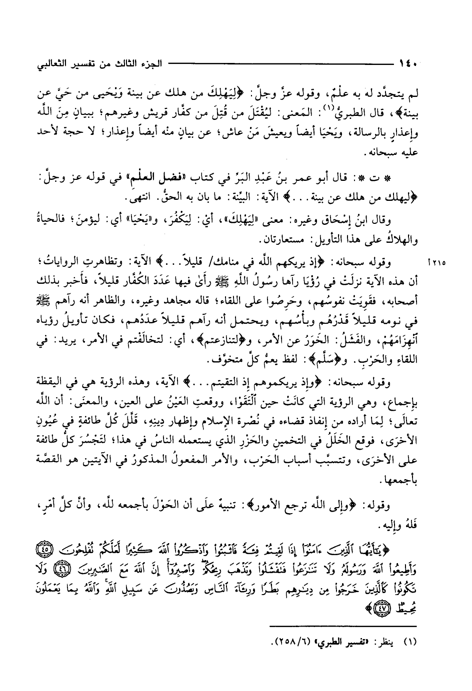 لم يتجدَّد له به علْمٌ، وقوله عزَّ وجلَّ: لِيَهْلِكَ مَنْ هَلَكَ عَنْ بَيِّنَةٍ وَيَحْيى مَنْ حَيَّ عَنْ بَيِّنَةٍ، قال الطبريُّ «1» : المَعنى: ليُقْتَلَ من قُتِلَ من كفَّار قريش وغيرهم ببيانٍ مِنَ اللَّه وإِعذارٍ بالرسالة، ويَحْيَا أيضاً ويعيشَ مَنْ عاش عن بيانٍ منْه أيضاً وإِعذار لا حجة لأحد عليه سبحانه.