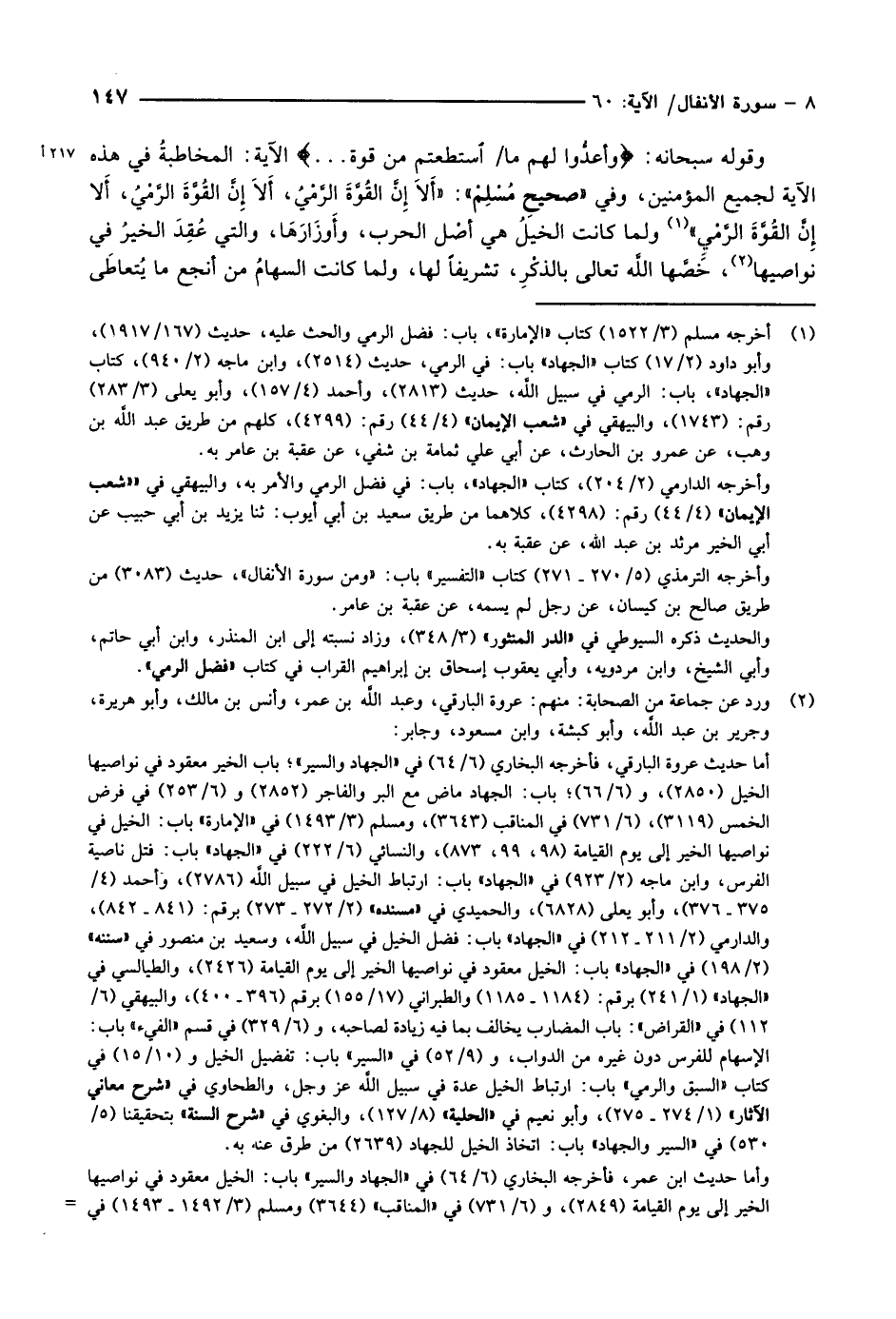 أما حديث عروة البارقي، فأخرجه البخاري (6/ 64) في «الجهاد والسير» باب الخير معقود في نواصيها الخيل (2850) ، و (6/ 66) باب: الجهاد ماض مع البر والفاجر (2852) و (6/ 253) في فرض الخمس (3119) ، (6/ 731) في المناقب (3643) ، ومسلم (3/ 1493) في «الإمارة» باب: الخيل في نواصيها الخير إلى يوم القيامة (98، 99، 873) ، والنسائي (6/ 222) في «الجهاد» باب: فتل ناصية الفرس، وابن ماجه (2/ 923) في «الجهاد» باب: ارتباط الخيل في سبيل الله (2786) ، وأحمد (4/ 375- 376) ، وأبو يعلى (6828) ، والحميدي في «مسنده» (2/ 272- 273) برقم: (841- 842) ، والدارمي (2/ 211- 212) في «الجهاد» باب: فضل الخيل في سبيل الله، وسعيد بن منصور في «سننه» (2/ 198) في «الجهاد» باب: الخيل معقود في نواصيها الخير إلى يوم القيامة (2426) ، والطيالسي في «الجهاد» (1/ 241) برقم: (1184- 1185) والطبراني (17/ 155) برقم (396- 400) ، والبيهقي (6/ 112) في «القراض» : باب المضارب يخالف بما فيه زيادة لصاحبه، و (6/ 329) في قسم «الفيء» باب: