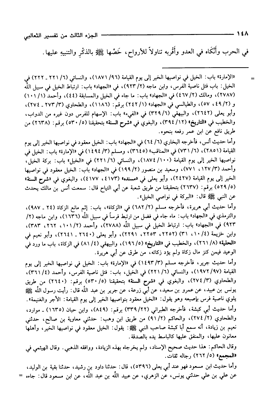 وأما حديث جرير، فأخرجه مسلم (3/ 1493) في «الإمارة» باب: الخيل في نواصيها الخير إلى يوم القيامة (97/ 1972) ، والنسائي (6/ 221) في الخيل، باب: فتل ناصية الفرس، وأحمد (4/ 361) ، والطحاوي (3/ 274) ، والبغوي في «شرح السنة» بتحقيقنا (5/ 530) برقم: (2640) من طريق يونس بن عبيد، عن عمرو بن سعيد، عن أبي زرعة، عن جرير بن عبد الله قال: رأيت رسول الله صلّى الله عليه وسلّم يلوي ناصية فرس بإصبعه وهو يقول: «الخيل معقود بنواصيها الخير إلى يوم القيامة: الأجر والغنيمة» .