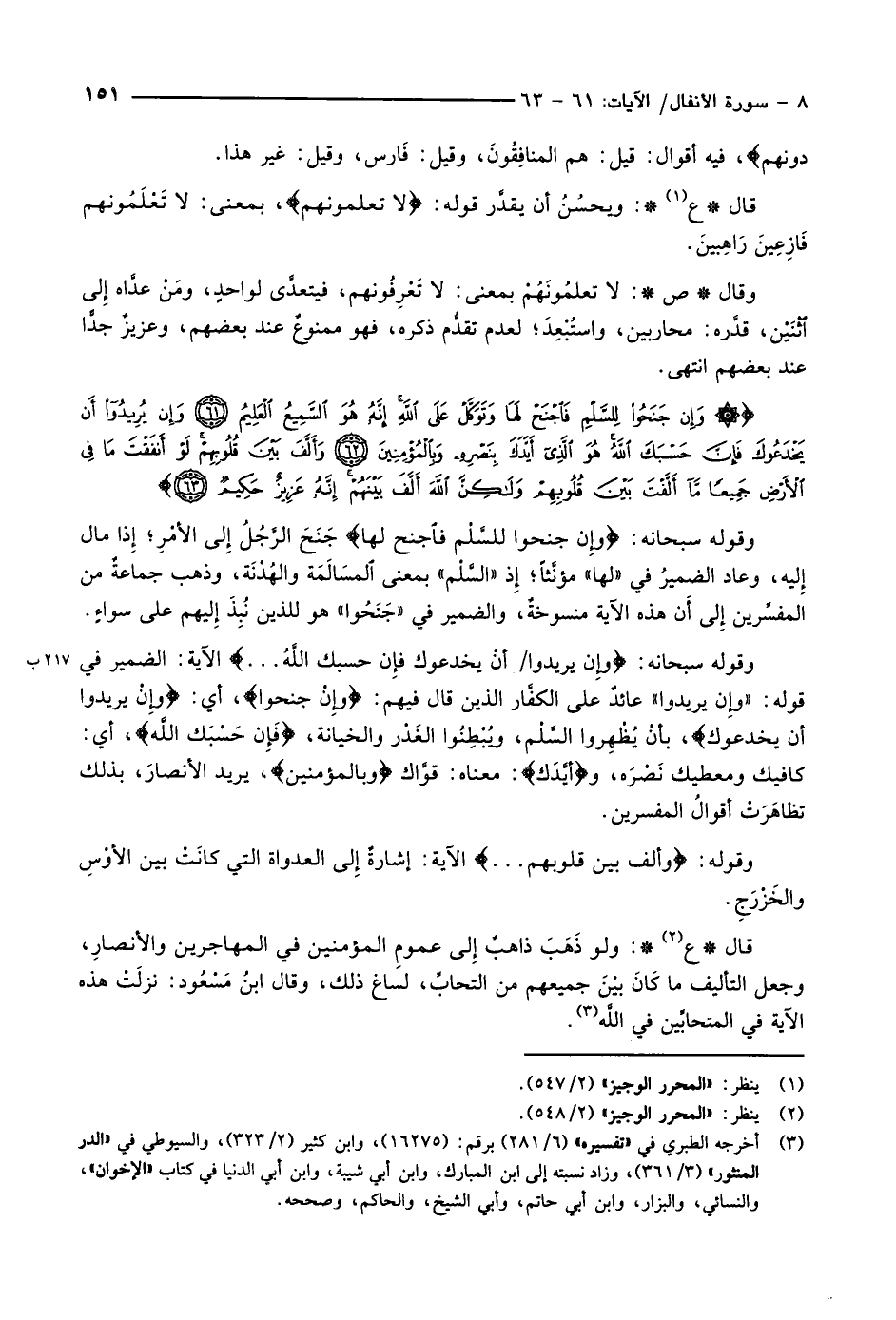 وَإِنْ جَنَحُوا لِلسَّلْمِ فَاجْنَحْ لَها وَتَوَكَّلْ عَلَى اللَّهِ إِنَّهُ هُوَ السَّمِيعُ الْعَلِيمُ (61) وَإِنْ يُرِيدُوا أَنْ يَخْدَعُوكَ فَإِنَّ حَسْبَكَ اللَّهُ هُوَ الَّذِي أَيَّدَكَ بِنَصْرِهِ وَبِالْمُؤْمِنِينَ (62) وَأَلَّفَ بَيْنَ قُلُوبِهِمْ لَوْ أَنْفَقْتَ مَا فِي الْأَرْضِ جَمِيعاً مَّا أَلَّفْتَ بَيْنَ قُلُوبِهِمْ وَلكِنَّ اللَّهَ أَلَّفَ بَيْنَهُمْ إِنَّهُ عَزِيزٌ حَكِيمٌ (63)