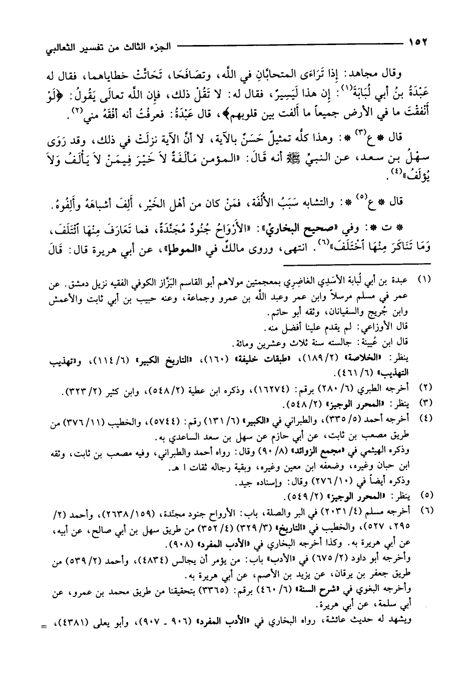 وقال مجاهد: إِذا تَرَاءَى المتحابَّانِ في اللَّه، وتصَافَحَا، تَحَاتَّتْ خطاياهما، فقال له عَبْدَةُ بنُ أبي لُبَابَةَ «1» : إِن هذا لَيَسِيرٌ، فقال له: لا تَقُلْ ذلك، فإِن اللَّه تعالَى يَقُولُ: لَوْ أَنْفَقْتَ مَا فِي الْأَرْضِ جَمِيعاً مَّا أَلَّفْتَ بَيْنَ قُلُوبِهِمْ، قال عَبْدَةُ: فعرفْتُ أنه أفْقَهُ مني «2» .