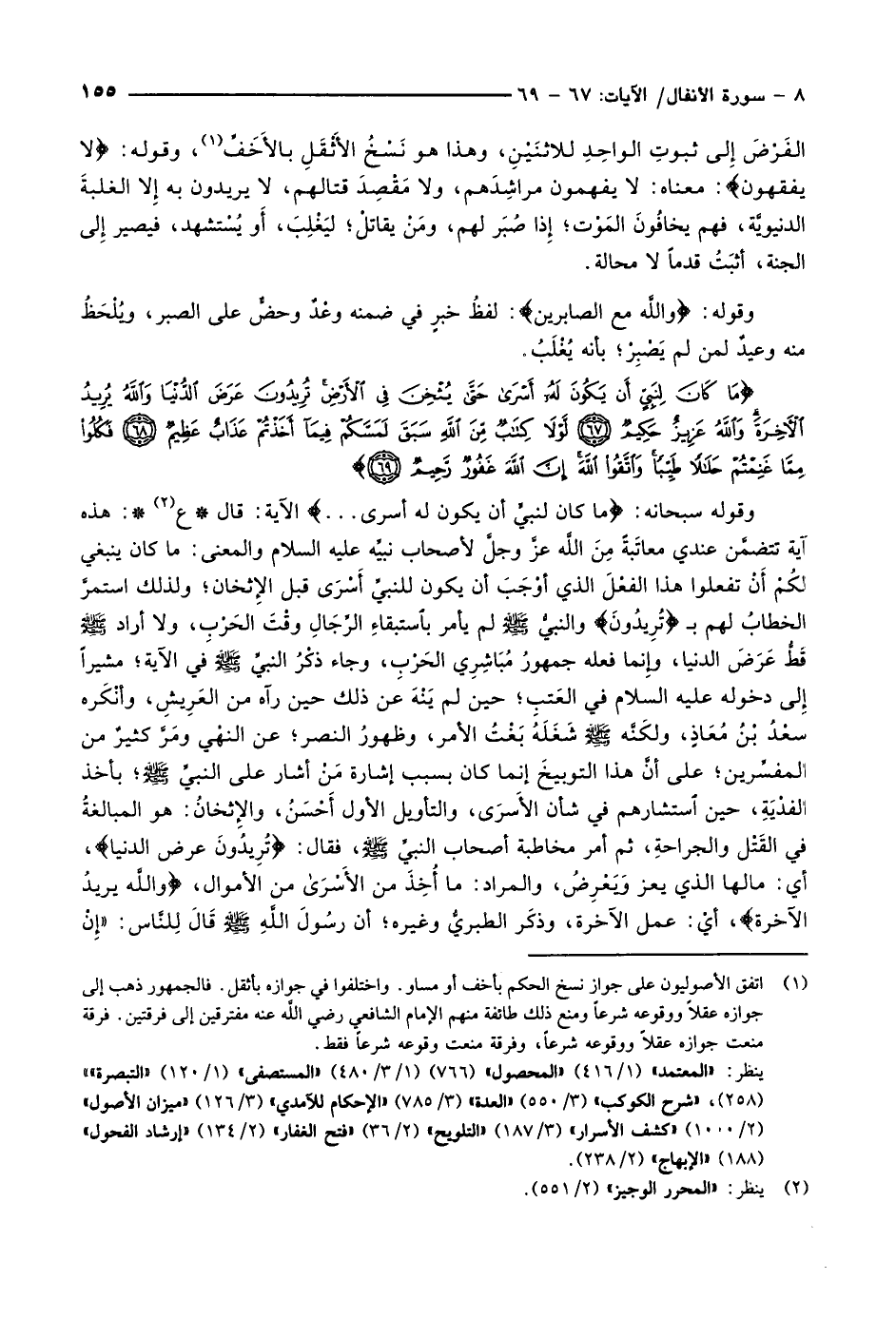 مَا كانَ لِنَبِيٍّ أَنْ يَكُونَ لَهُ أَسْرى حَتَّى يُثْخِنَ فِي الْأَرْضِ تُرِيدُونَ عَرَضَ الدُّنْيا وَاللَّهُ يُرِيدُ الْآخِرَةَ وَاللَّهُ عَزِيزٌ حَكِيمٌ (67) لَوْلا كِتابٌ مِنَ اللَّهِ سَبَقَ لَمَسَّكُمْ فِيما أَخَذْتُمْ عَذابٌ عَظِيمٌ (68) فَكُلُوا مِمَّا غَنِمْتُمْ حَلالاً طَيِّباً وَاتَّقُوا اللَّهَ إِنَّ اللَّهَ غَفُورٌ رَحِيمٌ (69)