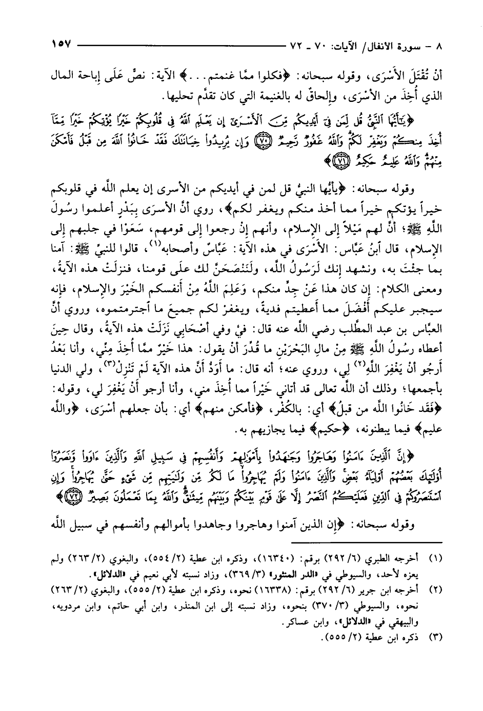 وقوله سبحانه: يا أَيُّهَا النَّبِيُّ قُلْ لِمَنْ فِي أَيْدِيكُمْ مِنَ الْأَسْرى إِنْ يَعْلَمِ اللَّهُ فِي قُلُوبِكُمْ خَيْراً يُؤْتِكُمْ خَيْراً مِمَّا أُخِذَ مِنْكُمْ وَيَغْفِرْ لَكُمْ، روي أنّ الأسرى ببدر أعلموا رسول الله صلّى الله عليه وسلّم أنَّ لهم مَيْلاً إِلى الإِسلام، وأنهم إِنْ رجعوا إِلى قومهم، سَعَوْا في جلبهم إِلى الإِسلام، قال ابن عَبَّاس: الأَسْرَى في هذه الآية: عبّاس وأصحابه «1» ، قالوا للنبيّ صلّى الله عليه وسلّم: آمنا بما جئْتَ به، ونشهد إِنك لَرَسُولُ اللَّه، ولَنَنْصَحَنَّ لك علَى قومنا، فنزلَتْ هذه الآيةُ، ومعنى الكلام: إِن كان هذا عَنْ جِدٍّ منكم، وَعَلِمَ اللَّهُ مِنْ أَنفسكم الخَيْرَ والإِسلام، فإِنه سيجبر عليكم أَفْضَلَ مما أَعطيتم فديةً، ويغفرْ لكم جميعَ ما اجترمتموه، وروي أنَّ العبَّاس بن عبد المطَّلب رضي اللَّه عنه قال: فيَّ وفي أصْحَابِي نَزَلَتْ هذه الآية، وقال حين أعطاه رسول الله صلّى الله عليه وسلّم مِنْ مالِ البَحْرَيْنِ ما قَدِّرَ أنْ يقول: هذا خَيْرٌ ممَّا أُخِذَ مِنِّي، وأنا بَعْدُ أَرجُو أنْ يَغْفِرَ اللَّهِ «2» لِي، وروي عنه أنه قال: ما أَوَدُّ أَنَّ هذه الآية لَمْ تَنْزِلْ «3» ، ولي الدنيا بأجمعها وذلك أن اللَّه تعالى قد أتاني خَيْراً مما أُخِذَ مني، وأنا أرجو أَنْ يَغْفِرَ لي، وقوله: