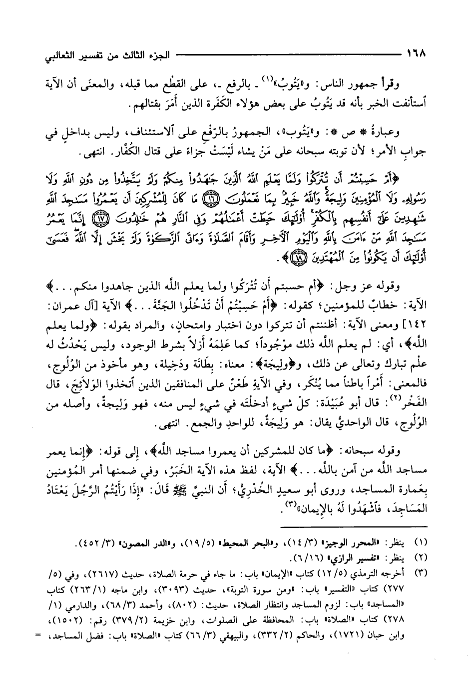 أَمْ حَسِبْتُمْ أَنْ تُتْرَكُوا وَلَمَّا يَعْلَمِ اللَّهُ الَّذِينَ جاهَدُوا مِنْكُمْ وَلَمْ يَتَّخِذُوا مِنْ دُونِ اللَّهِ وَلا رَسُولِهِ وَلا الْمُؤْمِنِينَ وَلِيجَةً وَاللَّهُ خَبِيرٌ بِما تَعْمَلُونَ (16) مَا كانَ لِلْمُشْرِكِينَ أَنْ يَعْمُرُوا مَساجِدَ اللَّهِ شاهِدِينَ عَلى أَنْفُسِهِمْ بِالْكُفْرِ أُولئِكَ حَبِطَتْ أَعْمالُهُمْ وَفِي النَّارِ هُمْ خالِدُونَ (17) إِنَّما يَعْمُرُ مَساجِدَ اللَّهِ مَنْ آمَنَ بِاللَّهِ وَالْيَوْمِ الْآخِرِ وَأَقامَ الصَّلاةَ وَآتَى الزَّكاةَ وَلَمْ يَخْشَ إِلاَّ اللَّهَ فَعَسى أُولئِكَ أَنْ يَكُونُوا مِنَ الْمُهْتَدِينَ (18)