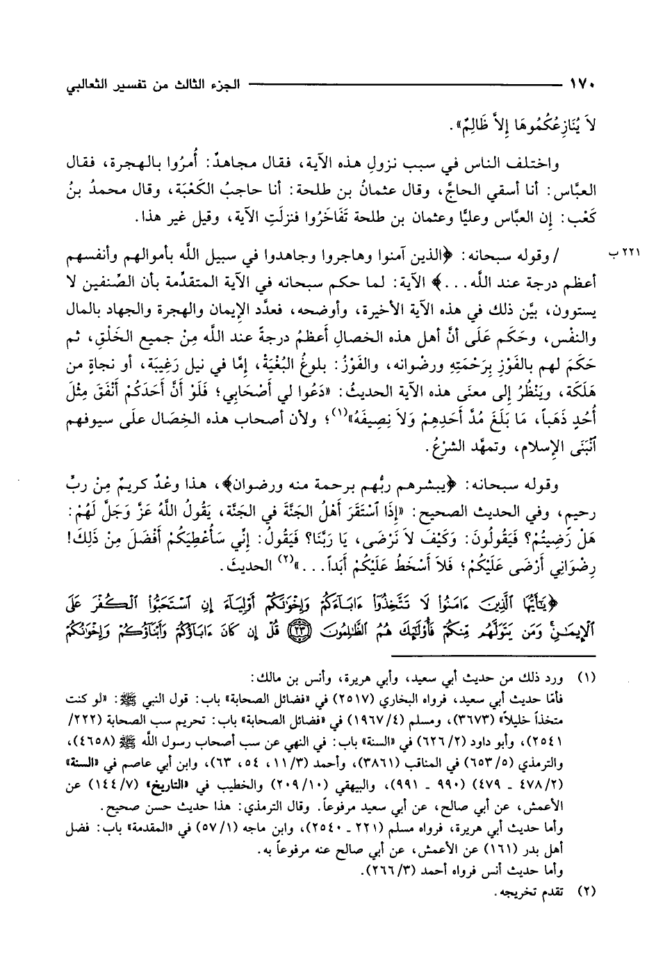 / وقوله سبحانه: الَّذِينَ آمَنُوا وَهاجَرُوا وَجاهَدُوا فِي سَبِيلِ اللَّهِ بِأَمْوالِهِمْ وَأَنْفُسِهِمْ أَعْظَمُ دَرَجَةً عِنْدَ اللَّهِ ... الآية: لما حكم سبحانه في الآية المتقدِّمة بأن الصِّنفين لا يستوون، بيَّن ذلك في هذه الآية الأخيرة، وأوضحه، فعدَّد الإِيمان والهجرة والجهاد بالمال والنفْس، وحَكَم عَلَى أنَّ أهل هذه الخصالِ أَعظمُ درجةً عند اللَّه مِنْ جميع الخَلْقِ، ثم حَكَمَ لهم بالفَوْزِ بِرَحْمَتِهِ ورضْوانه، والفَوْزُ: بلوغُ البُغْيَةْ، إمَّا في نيل رَغِيبَة، أو نجاةٍ من هَلَكَة، ويَنْظُرُ إِلى معنَى هذه الآية الحديثُ: «دَعُوا لي أَصْحَابِي فَلَوْ أَنَّ أَحَدَكُمْ أَنْفَقَ مِثْلَ أُحُدٍ ذَهَباً، مَا بَلَغَ مُدَّ أَحَدِهِمْ وَلاَ نِصِيفَهُ» «1» ولأن أصحاب هذه الخِصَال علَى سيوفهم انبنى الإِسلام، وتمهَّد الشرْعُ.