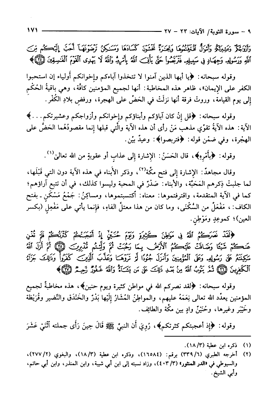 وقوله سبحانه: لَقَدْ نَصَرَكُمُ اللَّهُ فِي مَواطِنَ كَثِيرَةٍ وَيَوْمَ حُنَيْنٍ، هذه مخاطبةٌ لجميع المؤمنين يعدِّد الله تعالى نِعَمَهُ عليهم، والمواطِنُ المُشَارُ إلَيْها بَدْرٌ والخَنْدَق والنَّضير وقُرَيْظة وخَيْبَر وغيرها، وحُنَيْنٌ وادٍ بين مكَّة والطائِف.