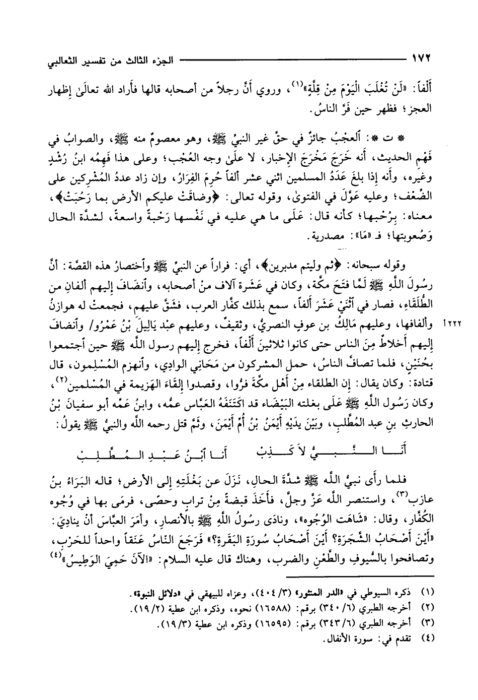 أَلْفاً: «لَنْ تُغْلَبَ الْيَوْمَ مِنْ قِلَّةٍ» «1» ، وروي أَنَّ رجلاً من أصحابه قالها فأَراد الله تعالى إظهار العجز فظهر حين فَرَّ الناسُ.
