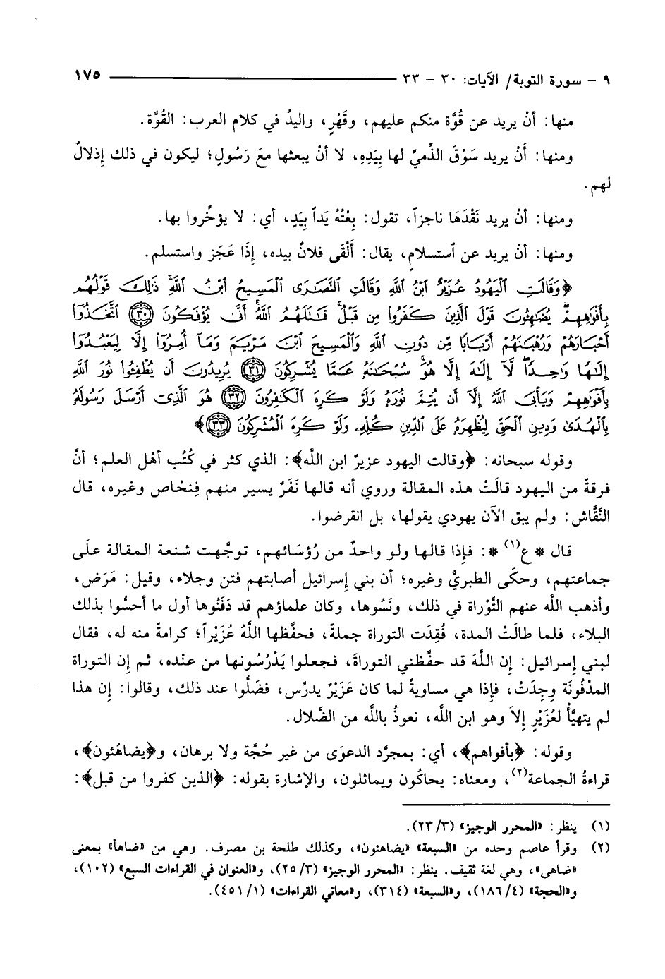 وَقالَتِ الْيَهُودُ عُزَيْرٌ ابْنُ اللَّهِ وَقالَتِ النَّصارى الْمَسِيحُ ابْنُ اللَّهِ ذلِكَ قَوْلُهُمْ بِأَفْواهِهِمْ يُضاهِؤُنَ قَوْلَ الَّذِينَ كَفَرُوا مِنْ قَبْلُ قاتَلَهُمُ اللَّهُ أَنَّى يُؤْفَكُونَ (30) اتَّخَذُوا أَحْبارَهُمْ وَرُهْبانَهُمْ أَرْباباً مِنْ دُونِ اللَّهِ وَالْمَسِيحَ ابْنَ مَرْيَمَ وَما أُمِرُوا إِلاَّ لِيَعْبُدُوا إِلهاً واحِداً لا إِلهَ إِلاَّ هُوَ سُبْحانَهُ عَمَّا يُشْرِكُونَ (31) يُرِيدُونَ أَنْ يُطْفِؤُا نُورَ اللَّهِ بِأَفْواهِهِمْ وَيَأْبَى اللَّهُ إِلاَّ أَنْ يُتِمَّ نُورَهُ وَلَوْ كَرِهَ الْكافِرُونَ (32) هُوَ الَّذِي أَرْسَلَ رَسُولَهُ بِالْهُدى وَدِينِ الْحَقِّ لِيُظْهِرَهُ عَلَى الدِّينِ كُلِّهِ وَلَوْ كَرِهَ الْمُشْرِكُونَ (33)