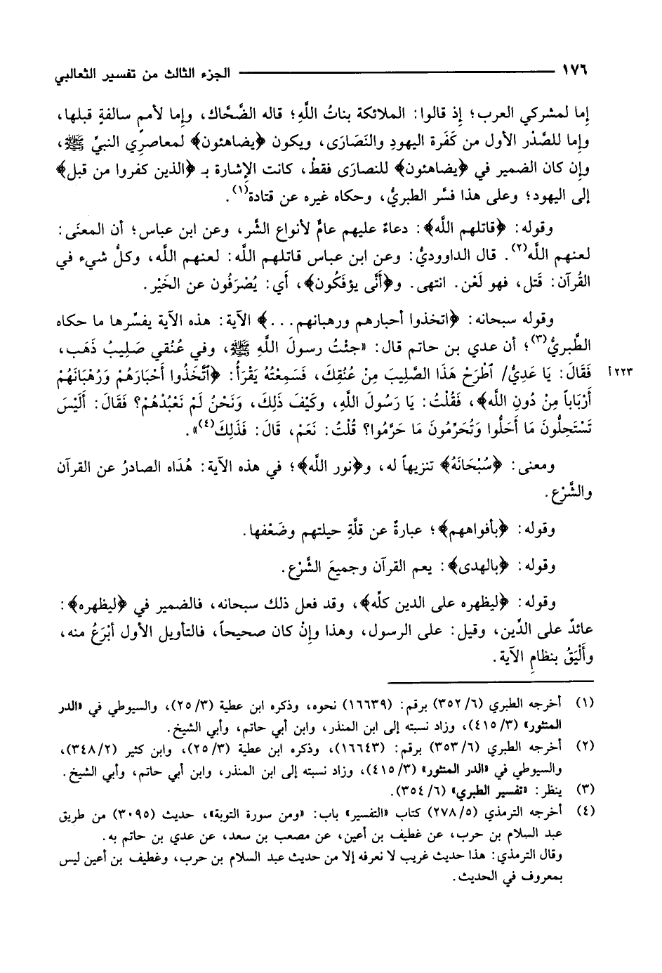 (4) أخرجه الترمذي (5/ 278) كتاب «التفسير» باب: «ومن سورة التوبة» ، حديث (3095) من طريق عبد السلام بن حرب، عن غطيف بن أعين، عن مصعب بن سعد، عن عدي بن حاتم به.