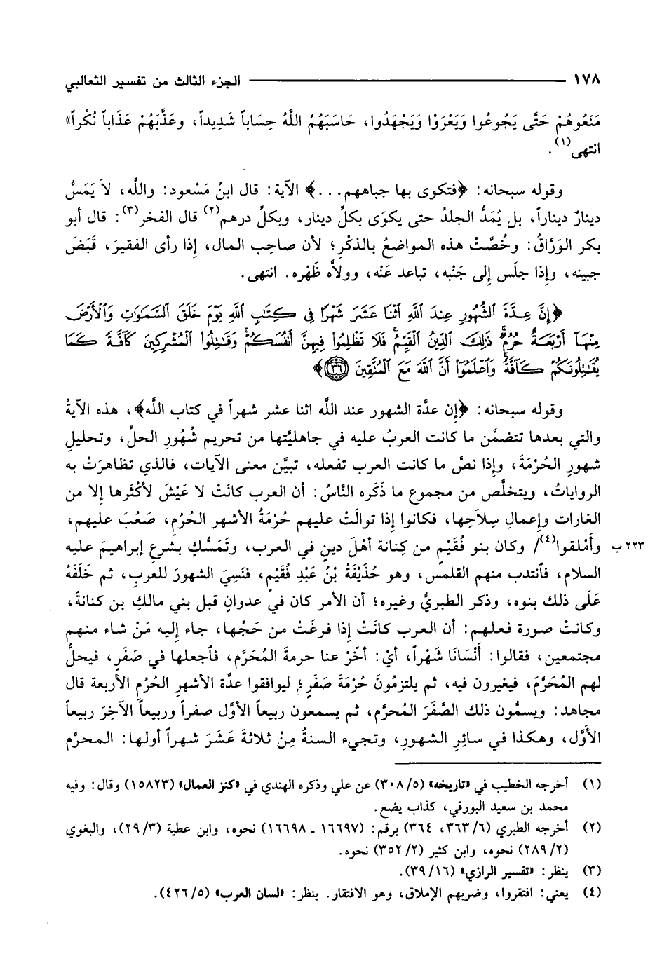 وقوله سبحانه: إِنَّ عِدَّةَ الشُّهُورِ عِنْدَ اللَّهِ اثْنا عَشَرَ شَهْراً فِي كِتابِ اللَّهِ، هذه الآيةُ والتي بعدها تتضمَّن ما كانت العربُ عليه في جاهليَّتها من تحريم شُهُورِ الحلِّ، وتحليلِ شهورِ الحُرْمَةَ، وإِذا نصَّ ما كانت العرب تفعله، تبيَّن معنى الآيات، فالذي تظاهرَتْ به الرواياتُ، ويتخلَّص من مجموع ما ذَكَره النَّاسُ: أن العرب كانَتْ لا عَيْشَ لأكْثَرها إِلا من الغارات وإِعمالِ سِلاَحِها، فكانوا إِذا توالَتْ عليهم حُرْمَةُ الأشهر الحُرُمِ، صَعُبَ عليهم، وأَمْلقوا «4» / وكان بنو فُقَيْمٍ من كِنانة أهْلَ دينٍ في العرب، وتَمَسُّكٍ بشرعِ إبراهيمَ عليه السلام، فانتدب منهم القلمس، وهو حُذَيْفَةُ بْنُ عَبْدِ فُقَيْمٍ، فنَسِيَ الشهورَ للعربِ، ثم خَلَفَهُ عَلَى ذلك بنوه، وذكر الطبريُّ وغيره أن الأمر كان في عدوانٍ قبل بني مالكِ بن كنانةً، وكانتْ صورة فعلهم: أن العرب كانَتْ إِذا فرغَتْ من حَجِّها، جاء إِليه مَنْ شاء منهم مجتمعين، فقالوا: أَنْسَانَا شَهْراً، أيْ: أخّرْ عنا حرمةَ المُحَرَّم، فاجعلها في صَفَرٍ، فيحلُّ لهم المُحَرَّمَ، فيغيرون فيه، ثم يلتزمُونَ حُرْمَةَ صَفَرٍ ليوافقوا عدَّة الأشهرِ الحُرُمِ الأربعة قال مجاهد: ويسمُّون ذلك الصَّفَرَ المُحرَّم، ثم يسمعون ربيعاً الأوَّل صفراً وربيعاً الآخِرَ ربيعاً الأَوَّل، وهكذا في سائِرِ الشهورِ، وتجيء السنةُ مِنْ ثلاثة عشر شهرا أولها: المحرّم