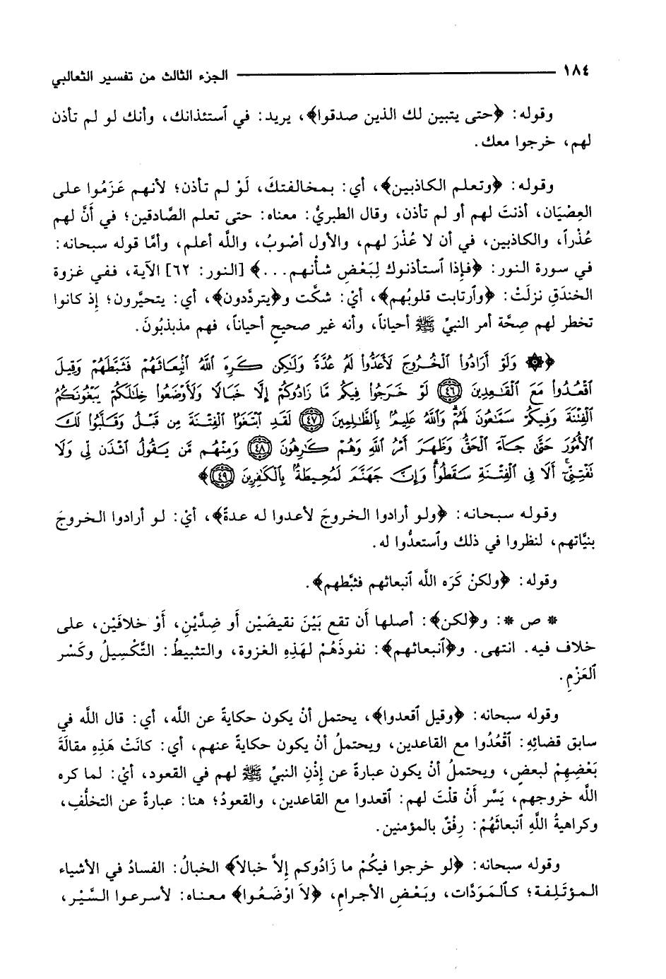 وَلَوْ أَرادُوا الْخُرُوجَ لَأَعَدُّوا لَهُ عُدَّةً وَلكِنْ كَرِهَ اللَّهُ انْبِعاثَهُمْ فَثَبَّطَهُمْ وَقِيلَ اقْعُدُوا مَعَ الْقاعِدِينَ (46) لَوْ خَرَجُوا فِيكُمْ مَّا زادُوكُمْ إِلاَّ خَبالاً وَلَأَوْضَعُوا خِلالَكُمْ يَبْغُونَكُمُ الْفِتْنَةَ وَفِيكُمْ سَمَّاعُونَ لَهُمْ وَاللَّهُ عَلِيمٌ بِالظَّالِمِينَ (47) لَقَدِ ابْتَغَوُا الْفِتْنَةَ مِنْ قَبْلُ وَقَلَّبُوا لَكَ الْأُمُورَ حَتَّى جاءَ الْحَقُّ وَظَهَرَ أَمْرُ اللَّهِ وَهُمْ كارِهُونَ (48) وَمِنْهُمْ مَنْ يَقُولُ ائْذَنْ لِي وَلا تَفْتِنِّي أَلا فِي الْفِتْنَةِ سَقَطُوا وَإِنَّ جَهَنَّمَ لَمُحِيطَةٌ بِالْكافِرِينَ (49)