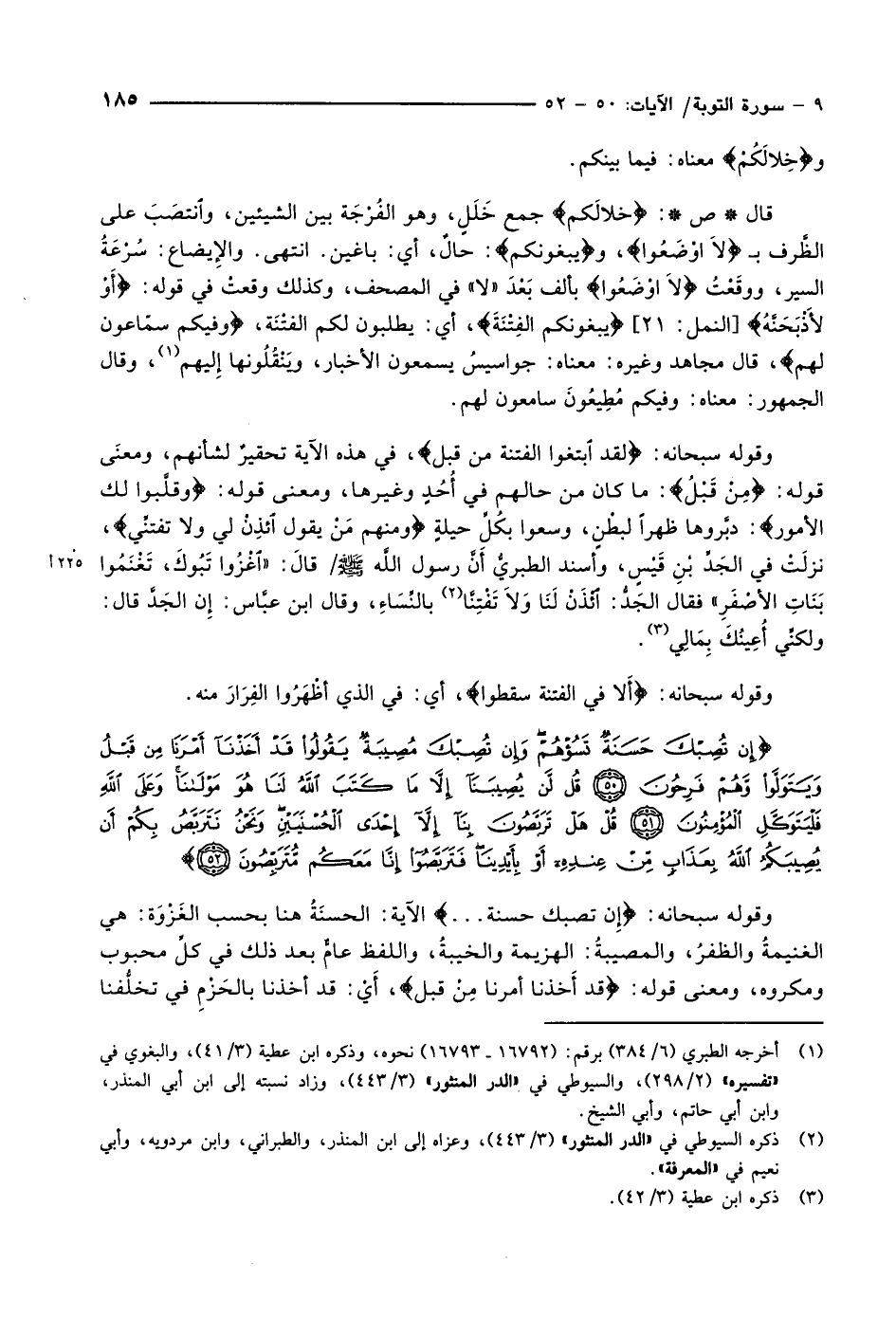 إِنْ تُصِبْكَ حَسَنَةٌ تَسُؤْهُمْ وَإِنْ تُصِبْكَ مُصِيبَةٌ يَقُولُوا قَدْ أَخَذْنا أَمْرَنا مِنْ قَبْلُ وَيَتَوَلَّوْا وَهُمْ فَرِحُونَ (50) قُلْ لَنْ يُصِيبَنا إِلاَّ مَا كَتَبَ اللَّهُ لَنا هُوَ مَوْلانا وَعَلَى اللَّهِ فَلْيَتَوَكَّلِ الْمُؤْمِنُونَ (51) قُلْ هَلْ تَرَبَّصُونَ بِنا إِلاَّ إِحْدَى الْحُسْنَيَيْنِ وَنَحْنُ نَتَرَبَّصُ بِكُمْ أَنْ يُصِيبَكُمُ اللَّهُ بِعَذابٍ مِنْ عِنْدِهِ أَوْ بِأَيْدِينا فَتَرَبَّصُوا إِنَّا مَعَكُمْ مُتَرَبِّصُونَ (52)
