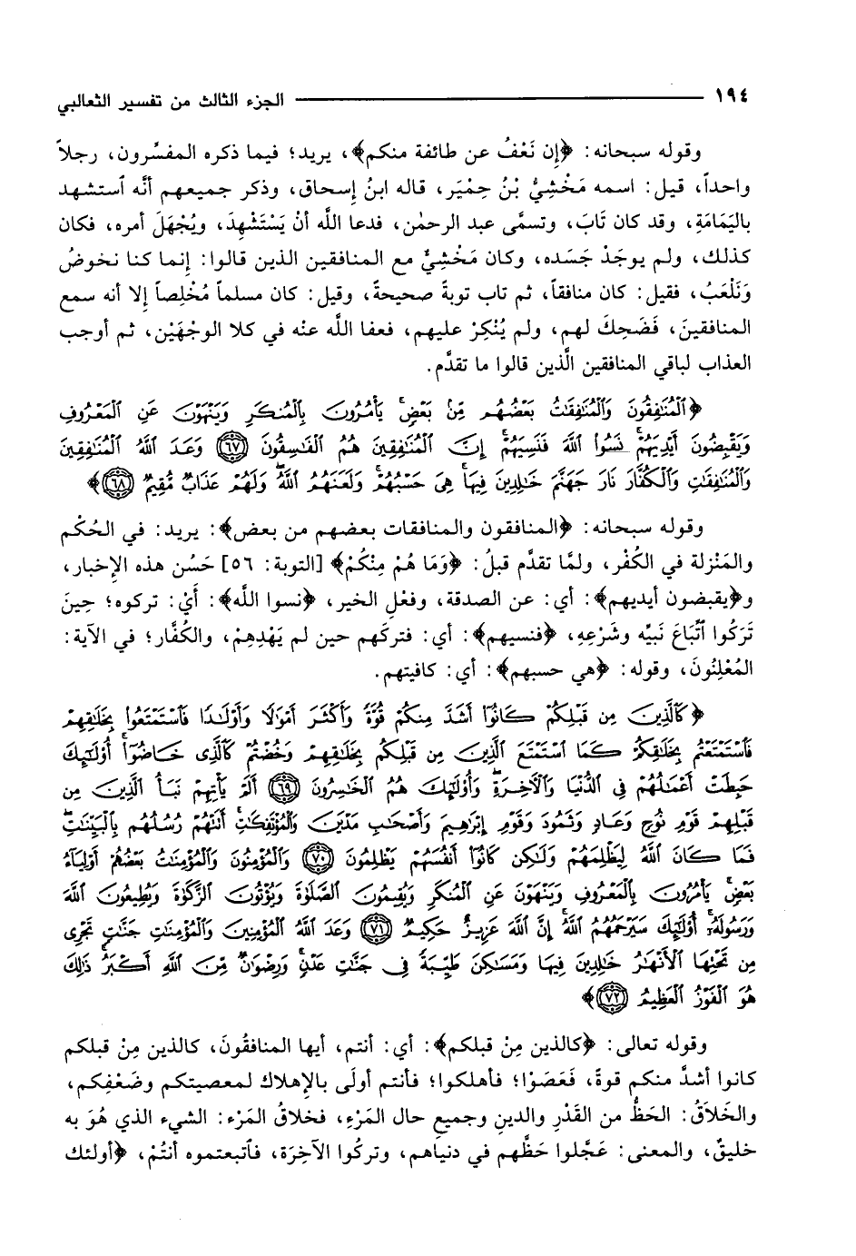 الْمُنافِقُونَ وَالْمُنافِقاتُ بَعْضُهُمْ مِنْ بَعْضٍ يَأْمُرُونَ بِالْمُنْكَرِ وَيَنْهَوْنَ عَنِ الْمَعْرُوفِ وَيَقْبِضُونَ أَيْدِيَهُمْ نَسُوا اللَّهَ فَنَسِيَهُمْ إِنَّ الْمُنافِقِينَ هُمُ الْفاسِقُونَ (67) وَعَدَ اللَّهُ الْمُنافِقِينَ وَالْمُنافِقاتِ وَالْكُفَّارَ نارَ جَهَنَّمَ خالِدِينَ فِيها هِيَ حَسْبُهُمْ وَلَعَنَهُمُ اللَّهُ وَلَهُمْ عَذابٌ مُقِيمٌ (68)
