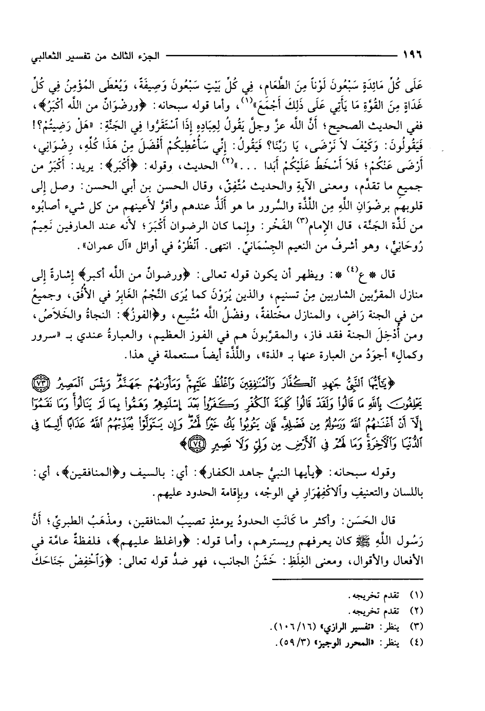 قال ع «4» : ويظهر أن يكون قوله تعالى: وَرِضْوانٌ مِنَ اللَّهِ أَكْبَرُ إِشارةً إِلى منازل المقرَّبين الشاربين مِنْ تسنيمٍ، والذين يَرَوْنَ كما يُرَى النَّجْمُ الغَابِرُ في الأُفُق، وجميعُ من في الجنة رَاضٍ، والمنازل مختلفةٌ، وفضل الله متّسع، والْفَوْزُ: النجاةُ والخَلاَصُ، ومن أُدْخِلَ الجنة فقد فاز، والمقرَّبونَ هم في الفوز العظيم، والعبارةُ عندي ب «سرور وكمالٍ» أجوَدُ من العبارة عنها ب «لذة» ، واللَّذَّة أيضاً مستعملة في هذا.