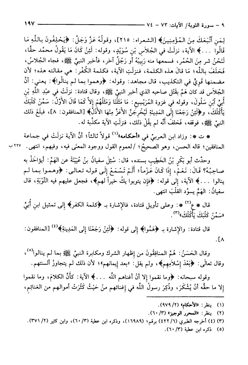 وَاخْفِضْ جَناحَكَ لِمَنِ اتَّبَعَكَ مِنَ الْمُؤْمِنِينَ [الشعراء: 215] ، وقولُهُ عَزَّ وَجَلَّ: يَحْلِفُونَ بِاللَّهِ مَا قالُوا ... الآية، نزلَتْ في الجُلاَسِ بْنِ سُوَيْدٍ، وقوله: لَئِنْ كَانَ مَا يَقُولُ محمَّد حقًّا، لَنَحْنُ شر مِنَ الحُمُر، فسمعها منه رَبِيبُهُ أو رجل آخر، فأخبر النبيّ صلّى الله عليه وسلّم، فجاء الجُلاسُ، فَحَلَفَ باللَّه مَا قالَ هذه الكلمة، فنزلَتِ الآية، فكلمة الكُفْر: هي مقالته هذه لأن مضمنها قَوِيٌّ في التكذيب، قال مجاهد: وقوله: وَهَمُّوا بِما لَمْ يَنالُوا: يعني: أنَّ الجُلاَس قد كان هَمَّ بقَتْل صاحبه الذي أخبر النبيّ صلّى الله عليه وسلّم، وقال قتادة: نزلَتْ في عبْدِ اللَّهِ بْنِ أُبيٍّ ابن سَلُولَ، وقوله في غزوة المُرَيْسِيعِ: مَا مَثَلُنَا وَمَثَلُهُمْ إِلاَّ كَمَا قَالَ الأَوَّلُ: سَمِّنْ كَلْبَكَ يَأْكُلْكَ، ولَئِنْ رَجَعْنا إِلَى الْمَدِينَةِ لَيُخْرِجَنَّ الْأَعَزُّ مِنْهَا الْأَذَلَ