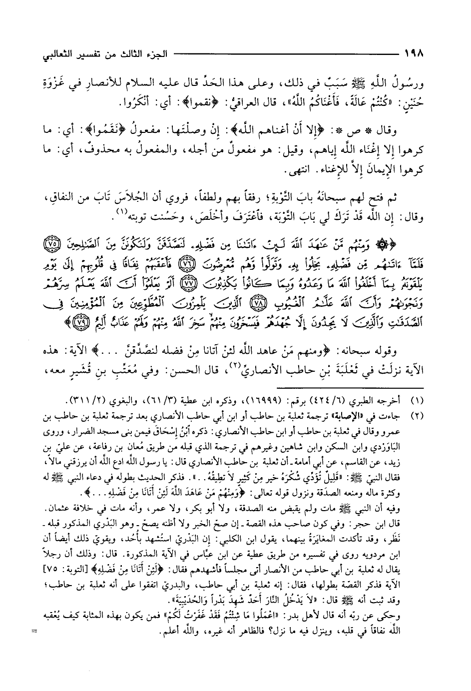 وقوله سبحانه: وَمِنْهُمْ مَنْ عاهَدَ اللَّهَ لَئِنْ آتانا مِنْ فَضْلِهِ لَنَصَّدَّقَنَّ ... الآية: هذه الآية نزلَتْ في ثَعْلَبَةَ بْنِ حاطب الأنصاريِّ «2» ، قال الحسن: وفي معتّب بن قشير معه،