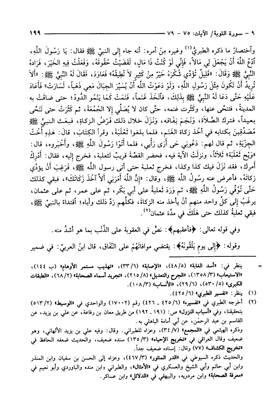 واختصار ما ذكره الطبريُّ «1» وغيره مِنْ أمره: أنه جاء إلى النبيّ صلّى الله عليه وسلّم فقال: يَا رَسُولَ اللَّهِ، ادع اللَّهَ أَنْ يَجْعَلَ لِي مَالاً، فَإِنِّي لَوْ كُنْتُ ذَا مَالٍ، لَقَضَيْتُ حُقُوقَهُ، وَفَعَلْتُ فِيهِ الخَيْرَ، فَرَادَهُ النّبيّ صلّى الله عليه وسلّم وَقَالَ: «قَلِيلٌ تُؤَدِّي شُكْرَهُ خَيْرٌ مِنْ كَثِيرٍ لا تطيقه» فعاود، فقال له النّبيّ صلّى الله عليه وسلّم: «أَلاَ تُرِيدُ أَنْ تَكُونَ مِثْلَ رَسُولِ اللَّهِ، وَلَوْ دَعَوْتُ اللَّه أَنْ يُسَيِّرَ الجِبَالَ مَعِي ذَهَباً، لَسَارَتْ» فَأَعَادَ عَلَيْهِ حَتَّى دَعَا لَهُ النّبيّ صلّى الله عليه وسلّم بِذَلِكَ، فاتخذ غَنَماً، فَنَمَتْ كَمَا يَنْمُو الدُّودُ حتى ضاقَتْ به المدينةُ، فتنحَّى عنها، وكَثُرت غنمه، حتَّى كان لا يُصَلِّي إِلا الجُمُعَةَ، ثم كَثُرَتْ حتى تَنَحَّى بعيداً، فترك الصَّلاَة، وَنَجَمَ نِفَاقه، وَنَزَلَ خلال ذلك فَرْضُ الزكاةِ، فبعث النبيّ صلّى الله عليه وسلّم مُصَدِّقِينَ بكتابه في أخْذ زكاة الغَنَمِ، فلما بلغوا ثَعْلَبَةَ، وقرأ الكِتَابَ، قالَ: هَذِهِ أُخْتُ الجِزْيَةِ، ثم قال لهم: دَعُونِي حَى أَرَى رأيي، فلما أتوا رسول الله صلّى الله عليه وسلّم، وأَخْبَروه، قال: