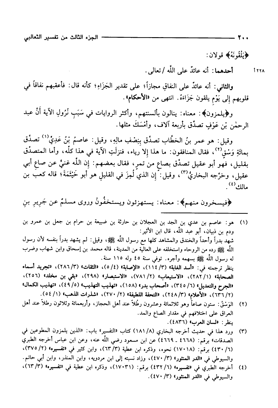 (3) ورد هذا في حديث أخرجه البخاري (8/ 181) كتاب «التفسير» باب: «الذين يلمزون المطوعين في الصدقات» برقم: (4668- 4669) عن ابن مسعود رضي الله عنه، وعن ابن عباس أخرجه الطبري (6/ 430) برقم: (17018) نحوه، وذكره ابن عطية (3/ 63) ، وابن كثير في «تفسيره» (2/ 375) ، والسيوطي في «الدر المنثور» (3/ 470) ، وزاد نسبته إلى ابن مردويه، وابن المنذر، وابن أبي حاتم.