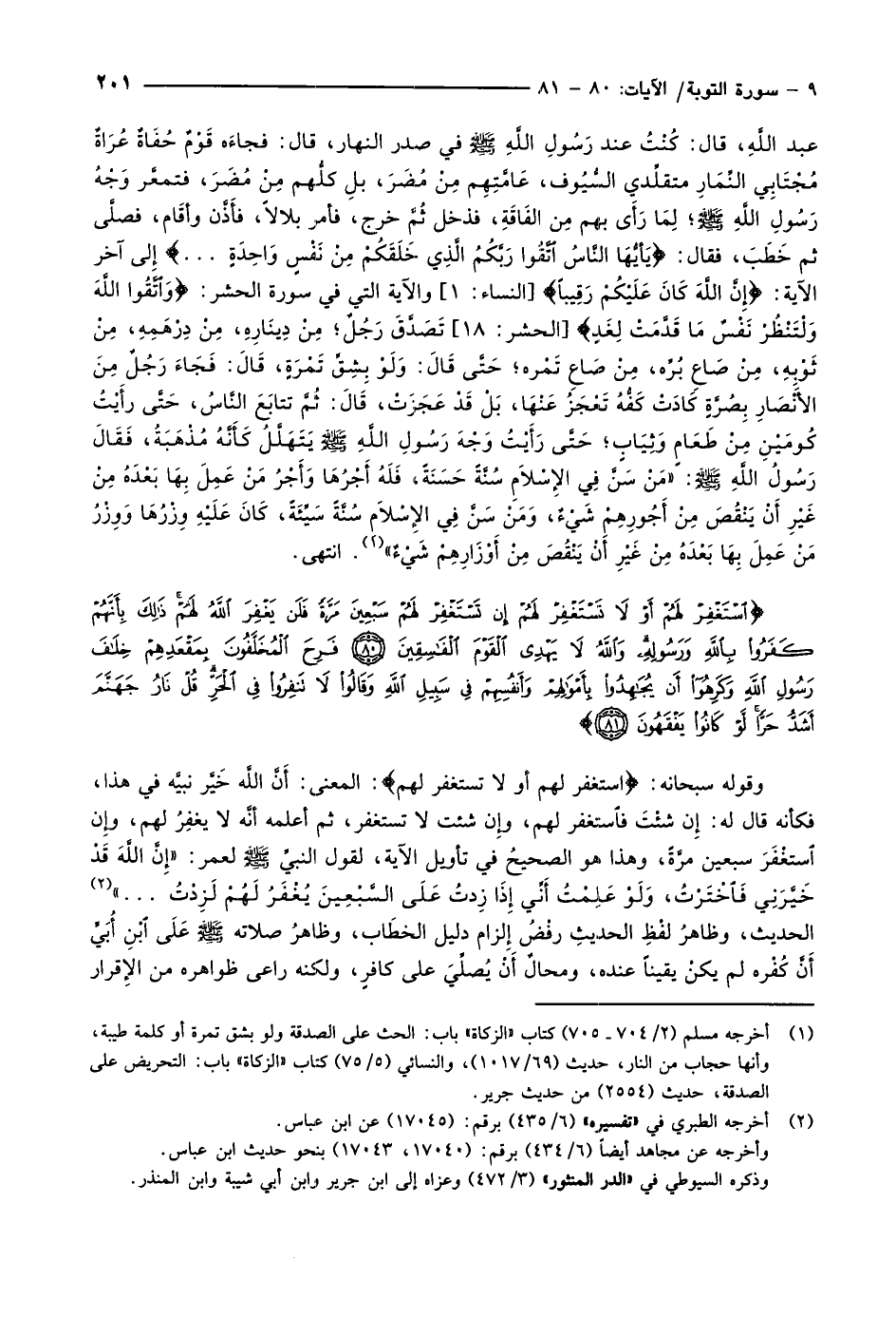 اسْتَغْفِرْ لَهُمْ أَوْ لا تَسْتَغْفِرْ لَهُمْ إِنْ تَسْتَغْفِرْ لَهُمْ سَبْعِينَ مَرَّةً فَلَنْ يَغْفِرَ اللَّهُ لَهُمْ ذلِكَ بِأَنَّهُمْ كَفَرُوا بِاللَّهِ وَرَسُولِهِ وَاللَّهُ لا يَهْدِي الْقَوْمَ الْفاسِقِينَ (80) فَرِحَ الْمُخَلَّفُونَ بِمَقْعَدِهِمْ خِلافَ رَسُولِ اللَّهِ وَكَرِهُوا أَنْ يُجاهِدُوا بِأَمْوالِهِمْ وَأَنْفُسِهِمْ فِي سَبِيلِ اللَّهِ وَقالُوا لا تَنْفِرُوا فِي الْحَرِّ قُلْ نارُ جَهَنَّمَ أَشَدُّ حَرًّا لَوْ كانُوا يَفْقَهُونَ (81)