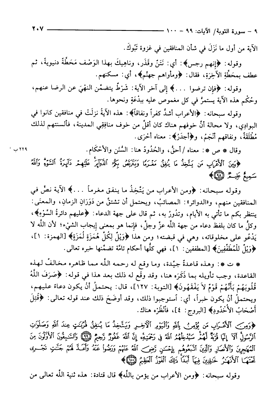 وقوله سبحانه: وَمِنَ الْأَعْرابِ مَنْ يَتَّخِذُ مَا يُنْفِقُ مَغْرَماً ... الآية نصٌّ في المنافقين منهم، و «الدوائر» : المصائبُ، ويحتمل أن تشتقَّ من دَوَرَانِ الزمانِ، والمعنَى: