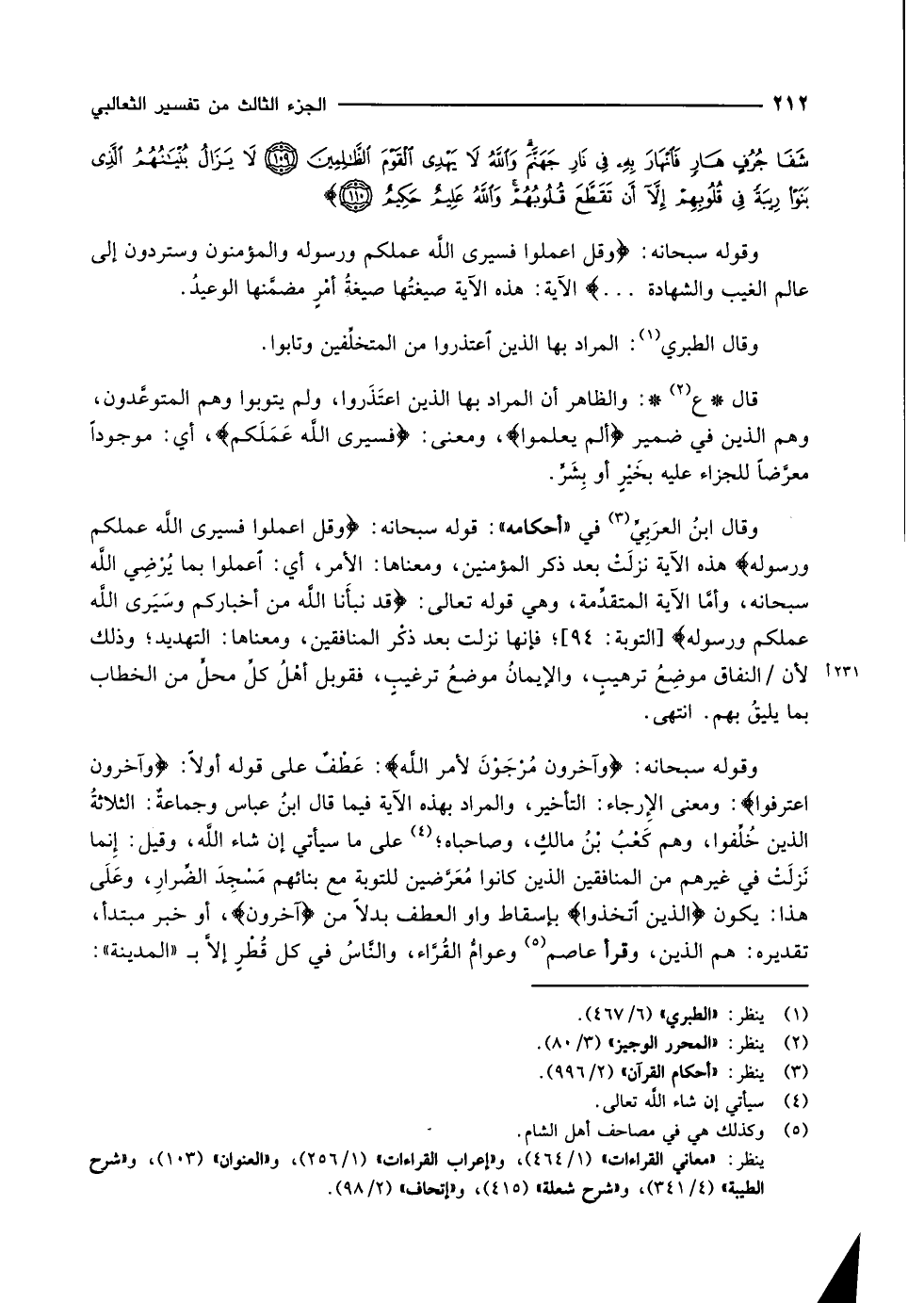 وقال الطبري «1» : المراد بها الذين اعتذروا من المتخلِّفين وتابوا.
