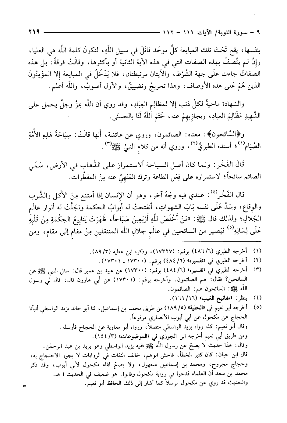 (3) أخرجه الطبري في «تفسيره» (6/ 484) برقم: (17300) عن عبيد بن عمير قال: سئل النبي صلّى الله عليه وسلّم عن السائحين؟ فقال: هم الصائمون. وأخرجه برقم: (17301) عن أبي هارون قال: قال لي رسول الله صلّى الله عليه وسلّم: السائحون هم: الصائمون.