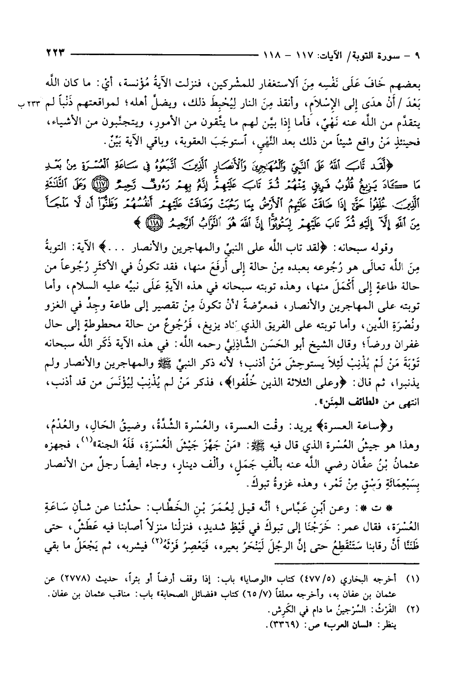 لَقَدْ تابَ اللَّهُ عَلَى النَّبِيِّ وَالْمُهاجِرِينَ وَالْأَنْصارِ الَّذِينَ اتَّبَعُوهُ فِي ساعَةِ الْعُسْرَةِ مِنْ بَعْدِ ما كادَ يَزِيغُ قُلُوبُ فَرِيقٍ مِنْهُمْ ثُمَّ تابَ عَلَيْهِمْ إِنَّهُ بِهِمْ رَؤُفٌ رَحِيمٌ (117) وَعَلَى الثَّلاثَةِ الَّذِينَ خُلِّفُوا حَتَّى إِذا ضاقَتْ عَلَيْهِمُ الْأَرْضُ بِما رَحُبَتْ وَضاقَتْ عَلَيْهِمْ أَنْفُسُهُمْ وَظَنُّوا أَنْ لاَّ مَلْجَأَ مِنَ اللَّهِ إِلاَّ إِلَيْهِ ثُمَّ تابَ عَلَيْهِمْ لِيَتُوبُوا إِنَّ اللَّهَ هُوَ التَّوَّابُ الرَّحِيمُ (118)