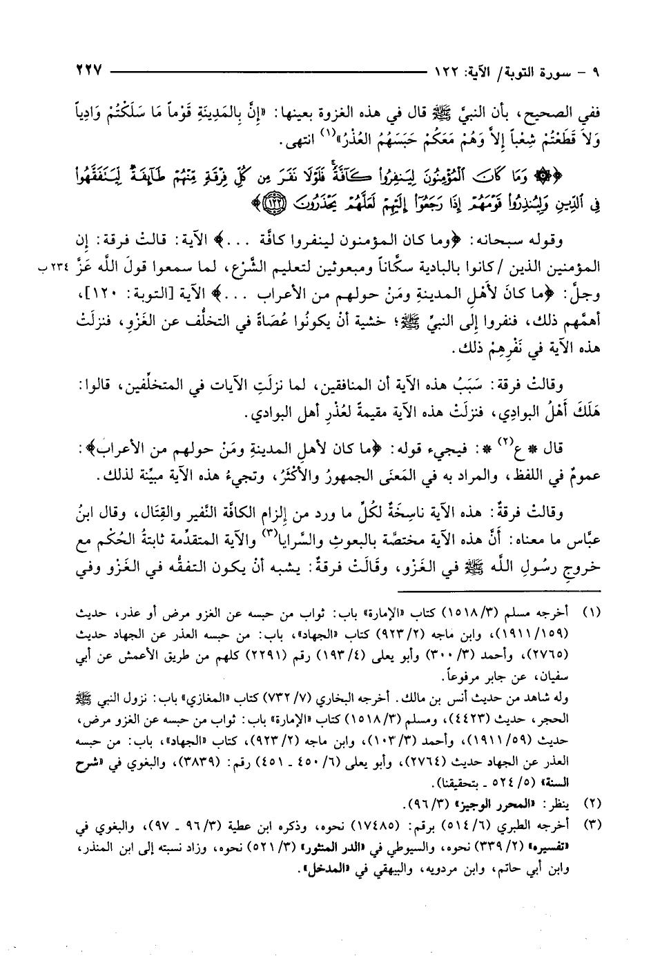وَما كانَ الْمُؤْمِنُونَ لِيَنْفِرُوا كَافَّةً فَلَوْلا نَفَرَ مِنْ كُلِّ فِرْقَةٍ مِنْهُمْ طائِفَةٌ لِيَتَفَقَّهُوا فِي الدِّينِ وَلِيُنْذِرُوا قَوْمَهُمْ إِذا رَجَعُوا إِلَيْهِمْ لَعَلَّهُمْ يَحْذَرُونَ (122)