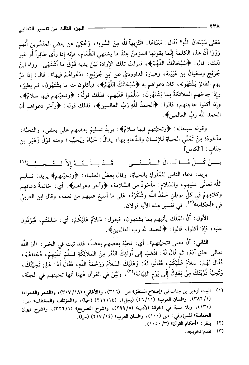 مَعْنَى سُبْحَانَ اللَّهِ؟ فَقَالَ: مَعْنَاهَا: «تَنْزِيهاً للَّهِ مِنَ السُّوءِ» ، وَحُكِيَ عن بعض المفسِّرين أَنهم رَوَوْا أَنَّ هذه الكلمةَ إِنَّما يقولها المؤمنُ عِنْدَ ما يشتهي الطَّعَام، فإِنه إِذا رأَى طائِراً أَو غير ذلك، قال: سُبْحانَكَ اللَّهُمَّ، فنزلتْ تلك الإِرادة بَيْنَ يديه فَوْقَ ما اشتهى. رواه ابنُ جُرَيْج وسفيانُ بن عُيَيْنة، وعبارة الداوديّ عن ابنِ جُرَيْج: «دَعْواهُمْ فيها» : قال: إِذا مَرَّ بهم الطائرُ يَشْتَهُونه، كان دعواهم به سُبْحانَكَ اللَّهُمَّ، فيأكلون منه ما يَشْتَهُونَ، ثم يطيرُ، وإِذا جاءتهم الملائكةُ بما يَشْتَهُونَ، سَلَّمُوا عَلَيْهم، فذلك قولُهُ: وَتَحِيَّتُهُمْ فِيها سَلامٌ، وإِذا أَكلوا حاجتهم، قالوا: الْحَمْدُ لِلَّهِ رَبِّ الْعالَمِينَ، فذلك قوله: وَآخِرُ دَعْواهُمْ أَنِ الْحَمْدُ لِلَّهِ رَبِّ الْعالَمِينَ.