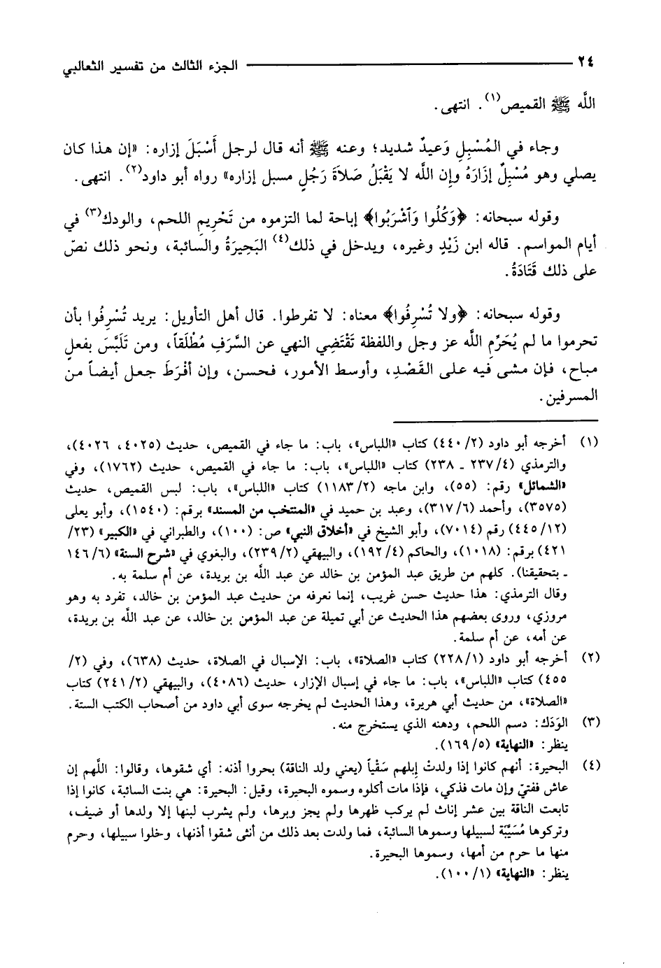 وقوله سبحانه: وَكُلُوا وَاشْرَبُوا إباحة لما التزموه من تَحْرِيمِ اللحم، والودك «3» في أيام المواسم. قاله ابن زَيْدٍ وغيره، ويدخل في ذلك «4» البَحِيرَةُ والسائبة، ونحو ذلك نصّ على ذلك قَتَادَةُ.