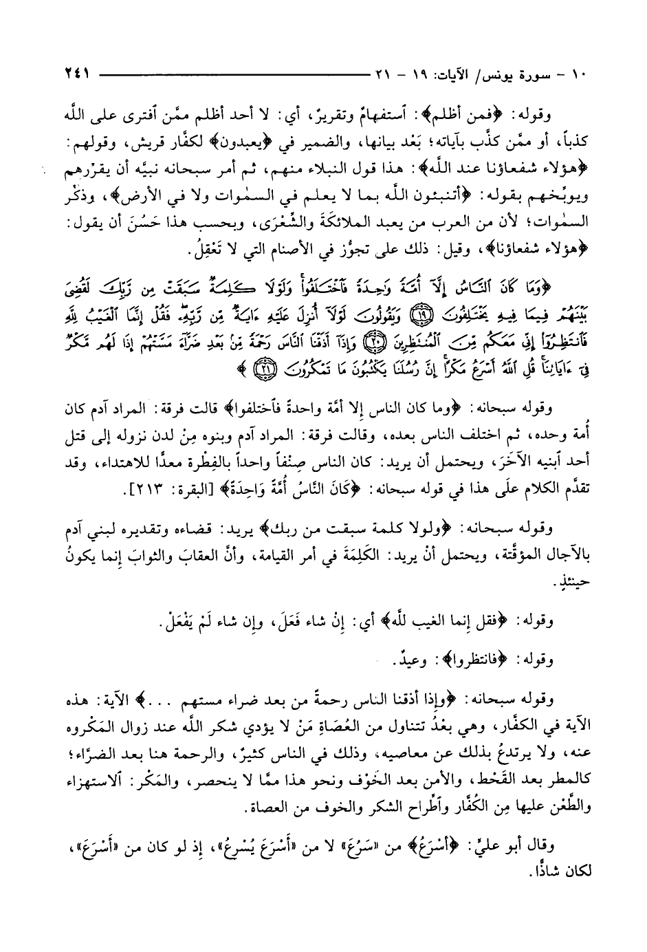وَما كانَ النَّاسُ إِلاَّ أُمَّةً واحِدَةً فَاخْتَلَفُوا وَلَوْلا كَلِمَةٌ سَبَقَتْ مِنْ رَبِّكَ لَقُضِيَ بَيْنَهُمْ فِيما فِيهِ يَخْتَلِفُونَ (19) وَيَقُولُونَ لَوْلا أُنْزِلَ عَلَيْهِ آيَةٌ مِنْ رَبِّهِ فَقُلْ إِنَّمَا الْغَيْبُ لِلَّهِ فَانْتَظِرُوا إِنِّي مَعَكُمْ مِنَ الْمُنْتَظِرِينَ (20) وَإِذا أَذَقْنَا النَّاسَ رَحْمَةً مِنْ بَعْدِ ضَرَّاءَ مَسَّتْهُمْ إِذا لَهُمْ مَكْرٌ فِي آياتِنا قُلِ اللَّهُ أَسْرَعُ مَكْراً إِنَّ رُسُلَنا يَكْتُبُونَ ما تَمْكُرُونَ (21)