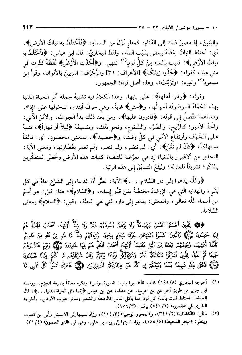 والبَنِينَ، إِذ مصيرُ ذلك إِلى الفَناءِ كمطرٍ نَزَلَ من السماءِ، فَاخْتَلَطَ بِهِ نَباتُ الْأَرْضِ، أي: اختلط النباتُ بعْضُهُ ببعض بسَبَبِ الماء، ولفظ البخاريِّ: قال ابن عباس: فَاخْتَلَطَ بِهِ نَباتُ الْأَرْضِ: فنبت بالماء مِنْ كلِّ لونٍ «1» انتهى. وأَخَذَتِ الْأَرْضُ لَفْظَةٌ كثُرت في مثل هذا، كقوله: خُذُوا زِينَتَكُمْ [الأعراف: 31] والزُّخْرُف: التزيينُ بالألوان، وقرأ ابن مسعود «2» وغيره: «وتَزَيَّنَتْ» ، وهذه أصل قراءة الجمهور.