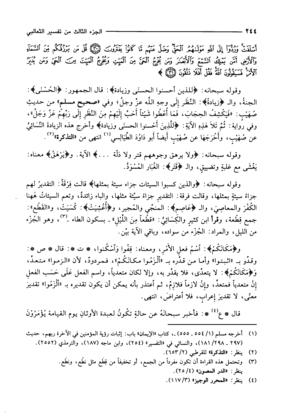 (1) أخرجه مسلم (1/ 554- 555) -، كتاب «الإيمان» باب: إثبات رؤية المؤمنين في الآخرة ربهم، حديث (297- 298/ 181) ، والنسائي في «التفسير» (254) ، وابن ماجه (187) ، والترمذي (2552) .