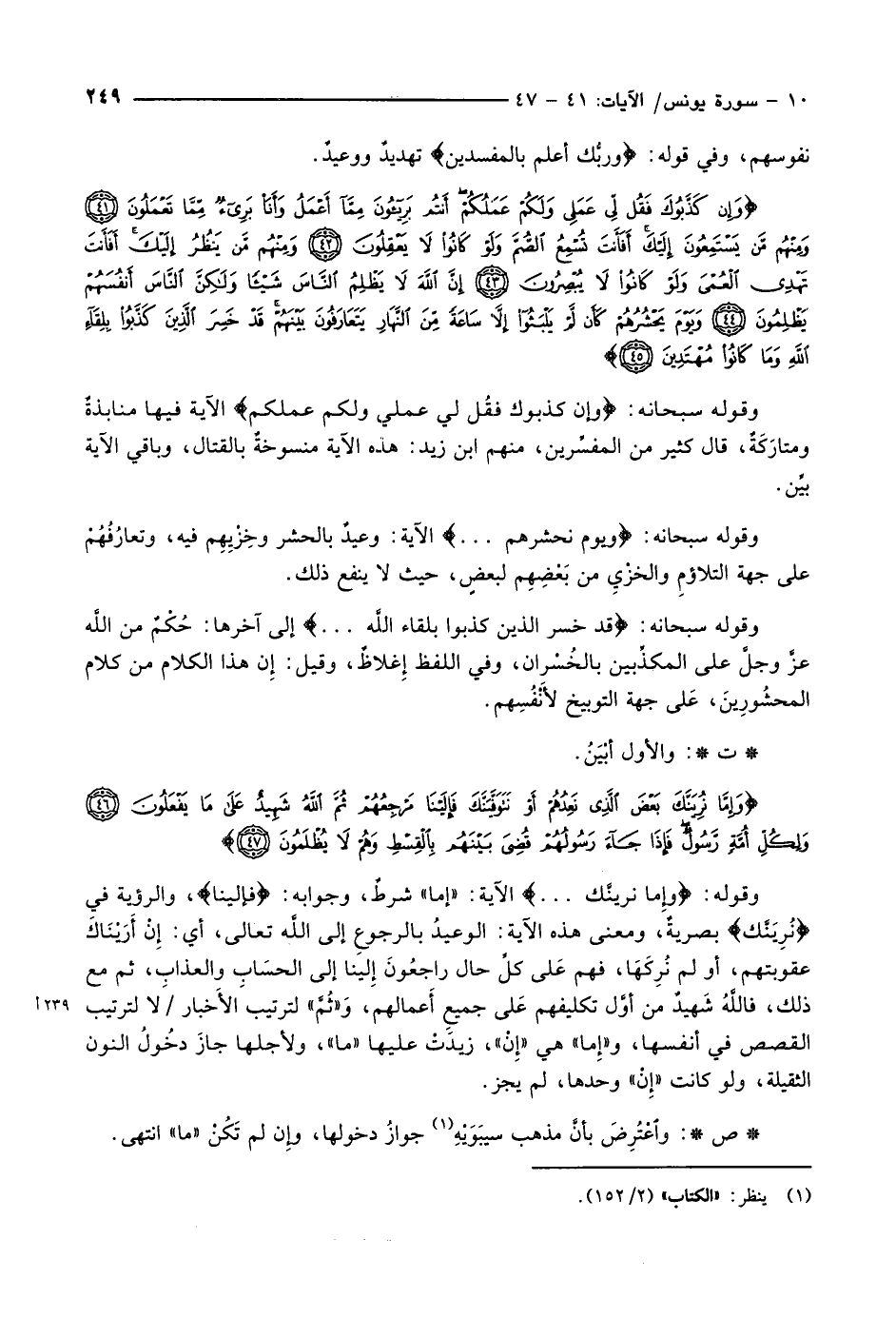 وقوله: وَإِمَّا نُرِيَنَّكَ ... الآية: «إما» شرطٌ، وجوابه: فَإِلَيْنا، والرؤية في نُرِيَنَّكَ بصريةٌ، ومعنى هذه الآية: الوعيدُ بالرجوعِ إلى اللَّه تعالى، أي: إِنْ أَرَيْنَاكَ عقوبتهم، أو لم نُرِكَهَا، فهم عَلى كلِّ حال راجعُونَ إِلينا إلى الحسَابِ والعذابِ، ثم مع ذلك، فاللَّهُ شَهيدٌ من أوَّل تكليفهم عَلى جميعِ أَعمالهم، وَ «ثُمَّ» لترتيب الأَخبار/ لا لترتيب القصص في أنفسها، و «إِما» هي «إِنْ» ، زيدَتْ عليها «ما» ، ولأجلها جازَ دخُولُ النون الثقيلة، ولو كانت «إِنْ» وحدها، لم يجز.