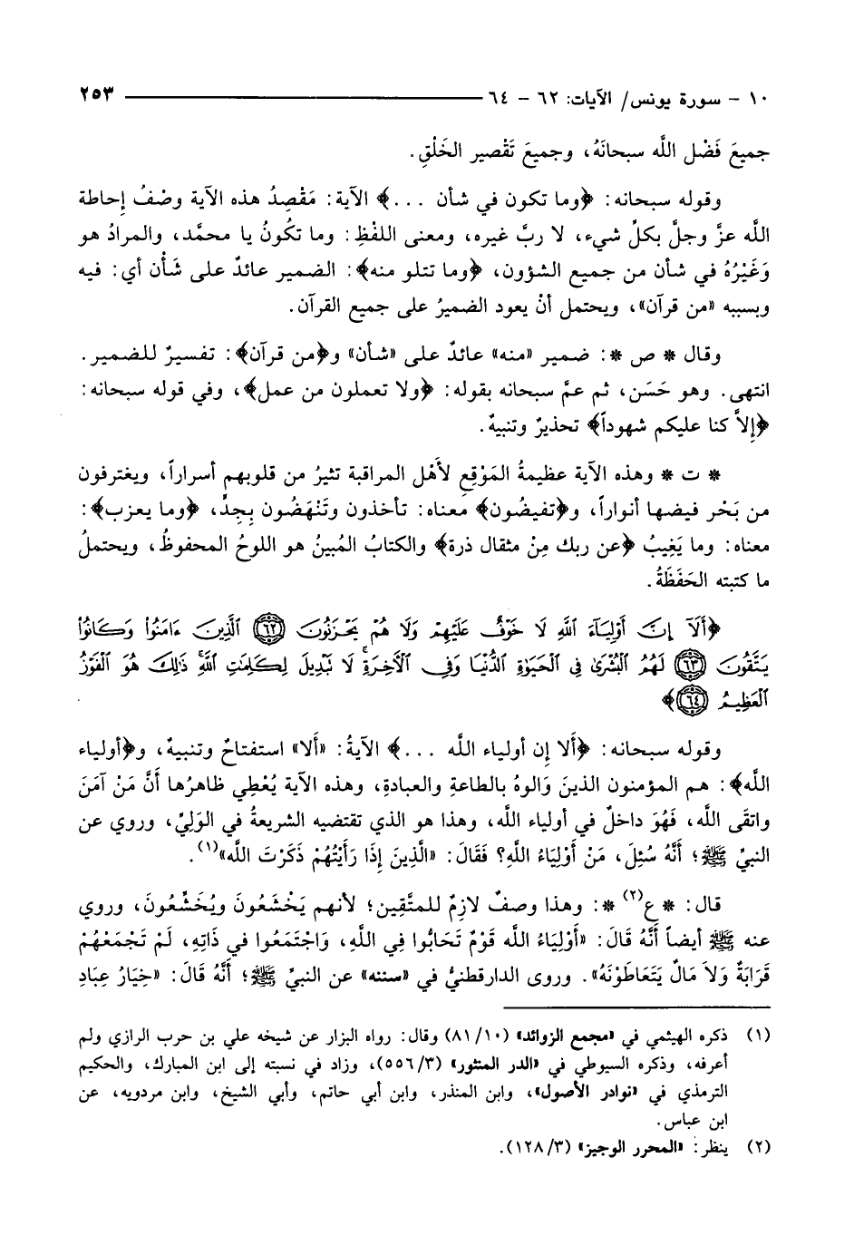 أَلا إِنَّ أَوْلِياءَ اللَّهِ لاَ خَوْفٌ عَلَيْهِمْ وَلا هُمْ يَحْزَنُونَ (62) الَّذِينَ آمَنُوا وَكانُوا يَتَّقُونَ (63) لَهُمُ الْبُشْرى فِي الْحَياةِ الدُّنْيا وَفِي الْآخِرَةِ لا تَبْدِيلَ لِكَلِماتِ اللَّهِ ذلِكَ هُوَ الْفَوْزُ الْعَظِيمُ (64)