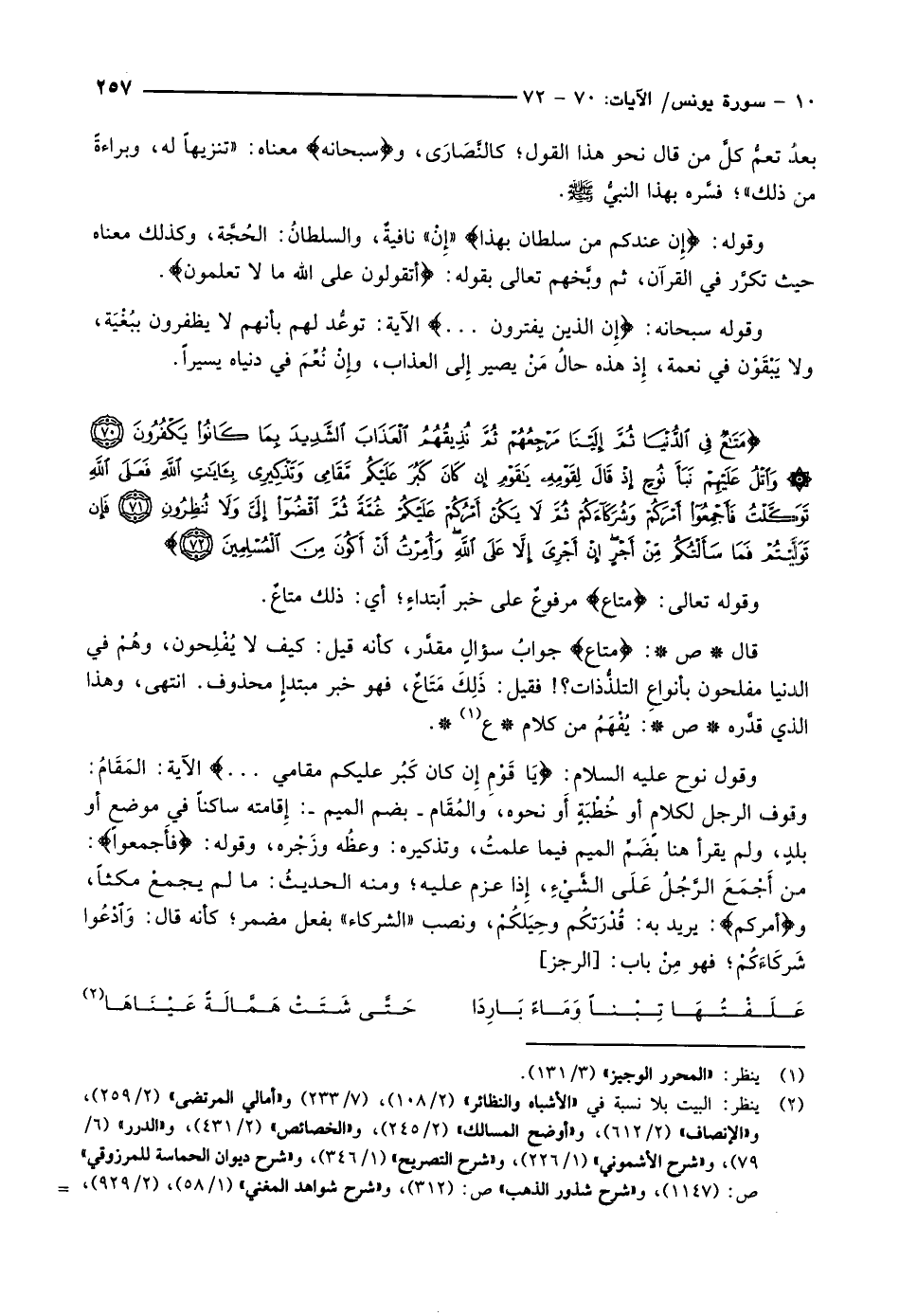 مَتاعٌ فِي الدُّنْيا ثُمَّ إِلَيْنا مَرْجِعُهُمْ ثُمَّ نُذِيقُهُمُ الْعَذابَ الشَّدِيدَ بِما كانُوا يَكْفُرُونَ (70) وَاتْلُ عَلَيْهِمْ نَبَأَ نُوحٍ إِذْ قالَ لِقَوْمِهِ يا قَوْمِ إِنْ كانَ كَبُرَ عَلَيْكُمْ مَقامِي وَتَذْكِيرِي بِآياتِ اللَّهِ فَعَلَى اللَّهِ تَوَكَّلْتُ فَأَجْمِعُوا أَمْرَكُمْ وَشُرَكاءَكُمْ ثُمَّ لا يَكُنْ أَمْرُكُمْ عَلَيْكُمْ غُمَّةً ثُمَّ اقْضُوا إِلَيَّ وَلا تُنْظِرُونِ (71) فَإِنْ تَوَلَّيْتُمْ فَما سَأَلْتُكُمْ مِنْ أَجْرٍ إِنْ أَجْرِيَ إِلاَّ عَلَى اللَّهِ وَأُمِرْتُ أَنْ أَكُونَ مِنَ الْمُسْلِمِينَ (72)