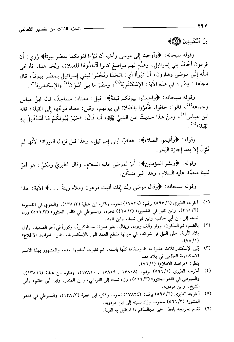 وقوله سبحانه: وَأَوْحَيْنا إِلى مُوسى وَأَخِيهِ أَنْ تَبَوَّءا لِقَوْمِكُما بِمِصْرَ بُيُوتاً رُوي: أَن فرعون أَخَافَ بني إِسرائيل، وهدَّم لهم مواضعَ كانوا اتخذوها للصلاة، ونَحْو هذا، فأوحَى اللَّه إِلَى موسَى وهارون، أنْ تَبَّوءا أي: اتخذا وتَخَيَّرا لبني إِسرائيل بمصْر بيوتاً، قال مجاهد: مِصْر في هذه الآية: الإِسْكَنْدَرِيَّة «1» ، ومصْرُ ما بين أَسْوَان «2» والإِسكندرية «3» .