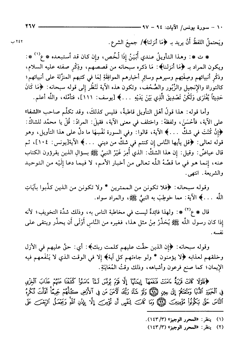 فَإِنْ كُنْتَ فِي شَكٍّ ... الآية، قالوا: وفي السورة نَفْسِهَا ما دلَّ على هذا التأويل، وهو قوله تعالى: قُلْ يا أَيُّهَا النَّاسُ إِنْ كُنْتُمْ فِي شَكٍّ مِنْ دِينِي ... الآية [يونس: 104] ، ثم قال عياضٌ: وقيل: إِن هذا الشكّ: الذي أمر غير النبيّ صلّى الله عليه وسلّم بسؤالِ الذين يقرؤون الكتاب عنه، إِنما هو في ما قصَّهُ اللَّه تعالى من أخبار الأمم، لا فيما دعا إِلَيْه من التوحيد والشريعة. انتهى.