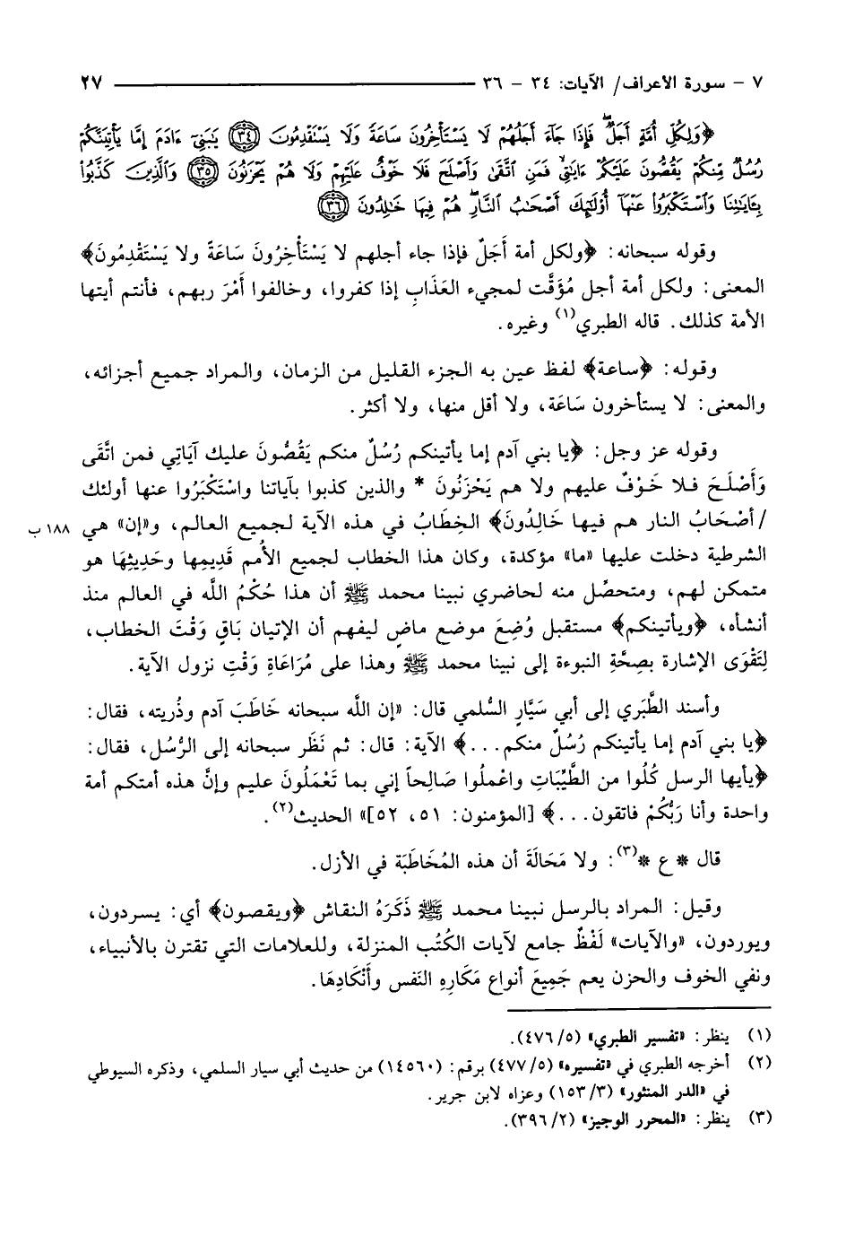 وَلِكُلِّ أُمَّةٍ أَجَلٌ فَإِذا جاءَ أَجَلُهُمْ لاَ يَسْتَأْخِرُونَ ساعَةً وَلا يَسْتَقْدِمُونَ (34) يا بَنِي آدَمَ إِمَّا يَأْتِيَنَّكُمْ رُسُلٌ مِنْكُمْ يَقُصُّونَ عَلَيْكُمْ آياتِي فَمَنِ اتَّقى وَأَصْلَحَ فَلا خَوْفٌ عَلَيْهِمْ وَلا هُمْ يَحْزَنُونَ (35) وَالَّذِينَ كَذَّبُوا بِآياتِنا وَاسْتَكْبَرُوا عَنْها أُولئِكَ أَصْحابُ النَّارِ هُمْ فِيها خالِدُونَ (36)