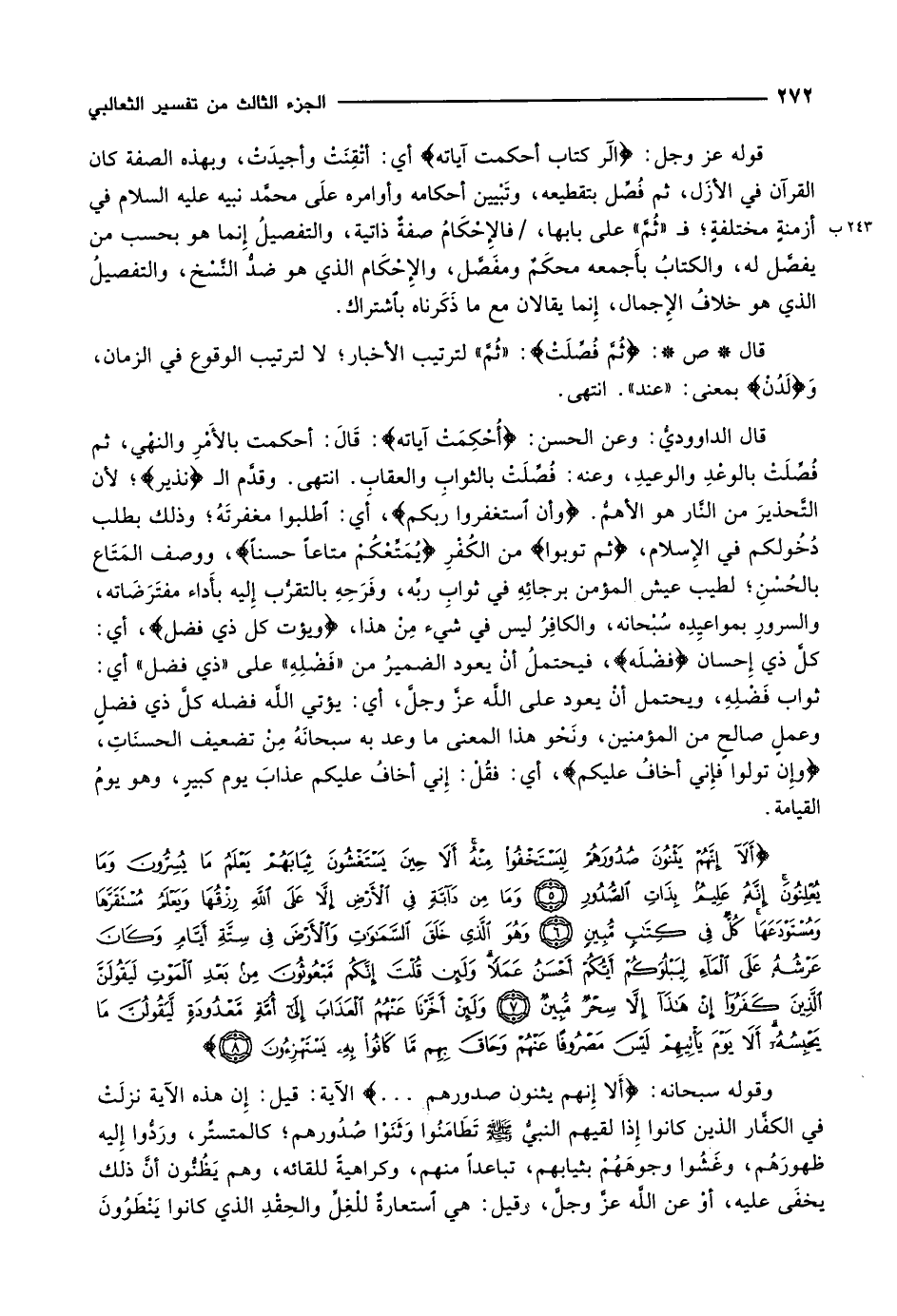 وقوله سبحانه: أَلا إِنَّهُمْ يَثْنُونَ صُدُورَهُمْ ... الآية: قيل: إِن هذه الآية نزلَتْ في الكفَّار الذين كانوا إذا لقيهم النبيّ صلّى الله عليه وسلّم تَطَامَنُوا وَثَنَوْا صُدُورهم كالمتستِّر، ورَدُّوا إِليه ظهورَهُم، وغَشُوا وجوهَهُمْ بثيابهم، تباعداً منهم، وكراهيةً للقائه، وهم يَظُنُّون أنَّ ذلك يخفَى عليه، أوْ عن اللَّه عزَّ وجلَّ، وقيل: هي استعارة للْغِلِّ والحِقْدِ الذي كانوا يَنْطَوُونَ