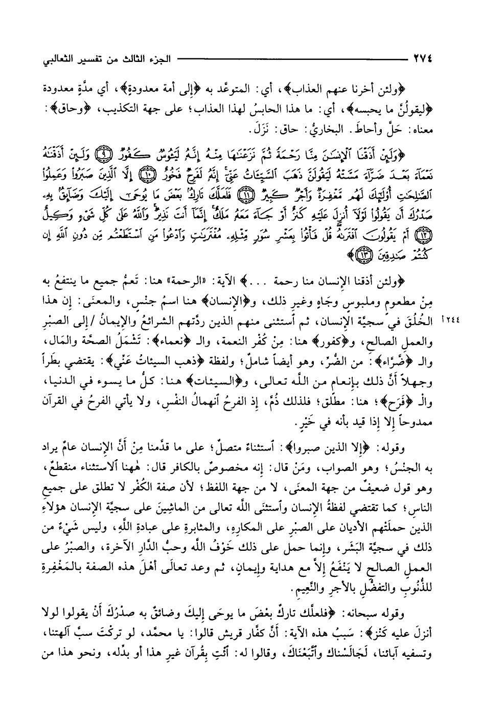 وَلَئِنْ أَذَقْنَا الْإِنْسانَ مِنَّا رَحْمَةً ثُمَّ نَزَعْناها مِنْهُ إِنَّهُ لَيَؤُسٌ كَفُورٌ (9) وَلَئِنْ أَذَقْناهُ نَعْماءَ بَعْدَ ضَرَّاءَ مَسَّتْهُ لَيَقُولَنَّ ذَهَبَ السَّيِّئاتُ عَنِّي إِنَّهُ لَفَرِحٌ فَخُورٌ (10) إِلاَّ الَّذِينَ صَبَرُوا وَعَمِلُوا الصَّالِحاتِ أُولئِكَ لَهُمْ مَغْفِرَةٌ وَأَجْرٌ كَبِيرٌ (11) فَلَعَلَّكَ تارِكٌ بَعْضَ مَا يُوحى إِلَيْكَ وَضائِقٌ بِهِ صَدْرُكَ أَنْ يَقُولُوا لَوْلا أُنْزِلَ عَلَيْهِ كَنْزٌ أَوْ جاءَ مَعَهُ مَلَكٌ إِنَّما أَنْتَ نَذِيرٌ وَاللَّهُ عَلى كُلِّ شَيْءٍ وَكِيلٌ (12) أَمْ يَقُولُونَ افْتَراهُ قُلْ فَأْتُوا بِعَشْرِ سُوَرٍ مِثْلِهِ مُفْتَرَياتٍ وَادْعُوا مَنِ اسْتَطَعْتُمْ مِنْ دُونِ اللَّهِ إِنْ كُنْتُمْ صادِقِينَ (13)