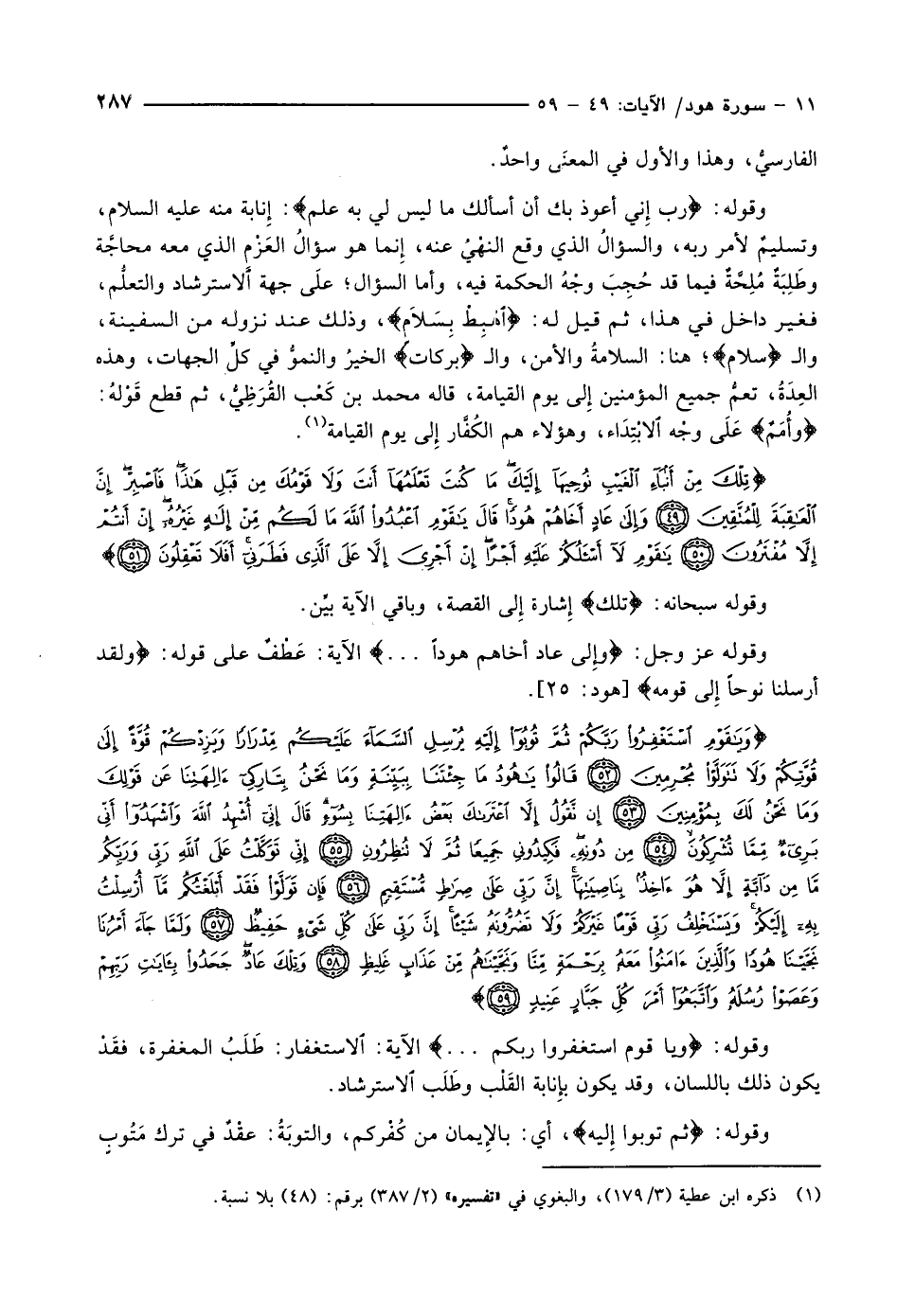 وقوله: رَبِّ إِنِّي أَعُوذُ بِكَ أَنْ أَسْئَلَكَ مَا لَيْسَ لِي بِهِ عِلْمٌ: إِنابة منه عليه السلام، وتسليمٌ لأمر ربه، والسؤالُ الذي وقع النهْيُ عنه، إِنما هو سؤالُ العَزْمِ الذي معه محاجَّة وطَلِبَةٌ مُلِحَّةٌ فيما قد حُجِبَ وجْهُ الحكمة فيه، وأما السؤال علَى جهة الاسترشاد والتعلُّم، فغير داخل في هذا، ثم قيل له: اهْبِطْ بِسَلامٍ، وذلك عند نزوله من السفينة، والسلام هنا: السلامة والأمن، والبركات الخيرُ والنموُّ في كلِّ الجهات، وهذه العِدَةُ، تعمُّ جميع المؤمنين إِلى يوم القيامة، قاله محمد بن كَعْب القُرَظِيُّ، ثم قطع قَوْلُهُ: