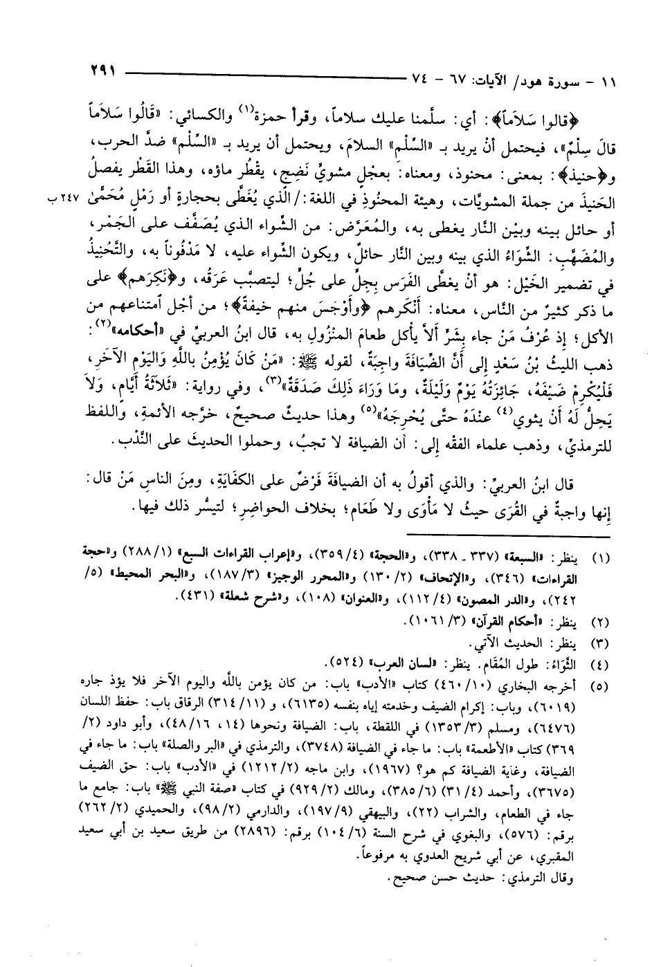 قالُوا سَلاماً: أي: سلَّمنا عليك سلاماً، وقرأ حمزة «1» والكسائي: «قَالُوا سَلاَماً قالَ سِلْمٌ» ، فيحتمل أنْ يريد ب «السِّلْمِ» السلامَ، ويحتمل أن يريد ب «السّلم» ضدّ الحرب، وحَنِيذٍ: بمعنى: محنوذ، ومعناه: بعجْلٍ مشويٍّ نَضِجٍ، يقْطُر ماؤه، وهذا القَطْر يفصلُ الحَنيذَ من جملة المشويَّات، وهيئة المحنُوذِ في اللغة: / الذي يُغَطَّى بحجارةٍ أو رَمْلٍ مُحَمًّى أو حائل بينه وبيْن النَّار يغطى به، والمُعَرَّض: من الشِّواء الذي يُصَفَّف على الجَمْر، والمُضَهَّبِ: الشِّوَاءُ الذي بينه وبين النَّار حائلٌ، ويكون الشِّواء عليه، لا مَدْفُوناً به، والتَّحُنِيذُ في تضمير الخَيْل: هو أنْ يغطَّى الفَرَس بِجِلٍّ على جُلٍّ ليتصبّب عرقه، ونَكِرَهُمْ على ما ذكر كثيرٌ من النَّاس، معناه: أَنْكَرهم وَأَوْجَسَ مِنْهُمْ خِيفَةً من أجْل امتناعهم من الأكل إِذ عُرْفُ مَنْ جاء بِشَرٍّ أَلاَّ يأْكل طعامَ المنْزُولِ به، قال ابنُ العربيِّ في «أحكامه» «2» :