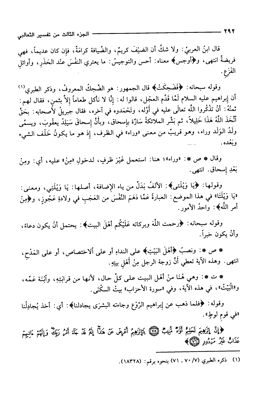 وقوله سبحانه: فَضَحِكَتْ قال الجمهور: هو الضَّحِكُ المعروفُ، وذكر الطبري «1» أن إِبراهيم عليه السلام لَمَّا قَدَّم العجْل، قالوا له: إِنَّا لا نأكل طعاماً إِلاَّ بثمنٍ، فقال لهم: