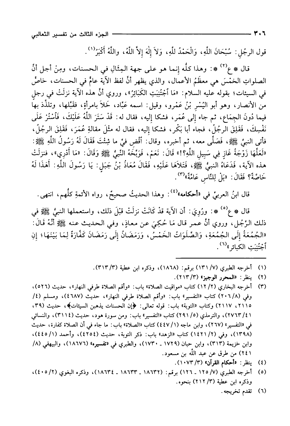 (3) أخرجه البخاري (2/ 12) كتاب «مواقيت الصلاة» باب: «وأقم الصلاة طرفي النهار» ، حديث (526) ، وفي (8/ 206) كتاب «التفسير» باب: «وأقم الصلاة طرفي النهار» ، حديث (4687) ، ومسلم (4/ 2115، 2117) وكتاب «التوبة» باب: قوله تعالى: إِنَّ الْحَسَناتِ يُذْهِبْنَ السَّيِّئاتِ، حديث (39، 41/ 2763) ، والترمذي (5/ 291) كتاب «التفسير» باب: ومن سورة هود، حديث (3114) ، والنسائي في «التفسير» (267) ، وابن ماجه (1/ 447) كتاب «الصلاة» باب: ما جاء في أن الصلاة كفارة، حديث (1398) ، وفي (2/ 1421) كتاب «الزهد» باب: ذكر التوبة، حديث (4254) ، وأحمد (1/ 445) ، وابن خزيمة (313) ، وابن حبان (1729- 1730) ، والطبري في «تفسيره» (18676) ، والبيهقي (8/ 241) من طرق عن عبد الله بن مسعود.